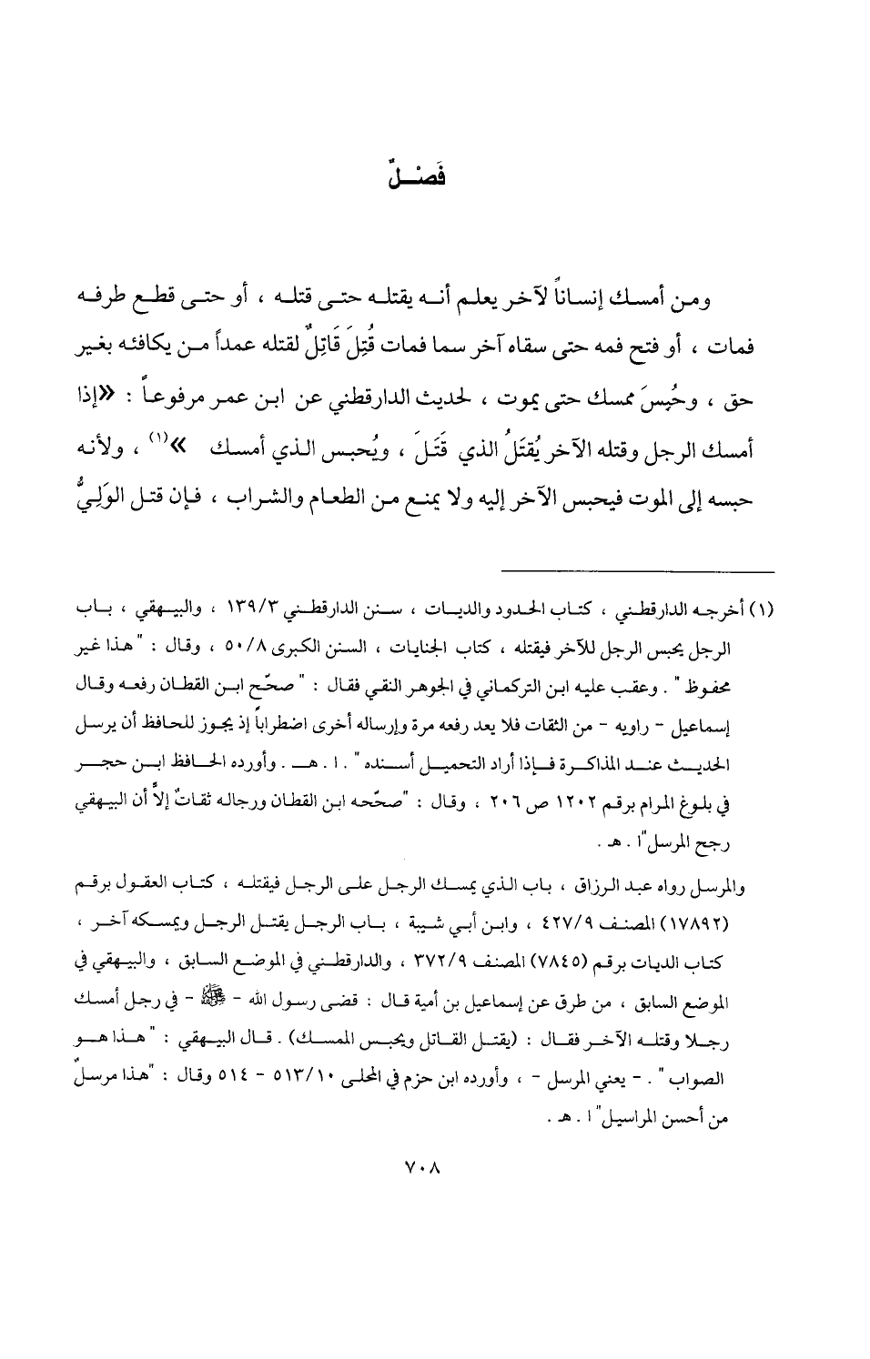 (¬1) أخرجه الدارقطني، كتاب الحدود والديات، سنن الدارقطني 3/ 139، والبيهقي، باب الرجل يحبس الرجل للآخر فيقتله، كتاب الجنايات، السنن الكبرى 8/ 50، وقال: "هذا غير محفوظ". وعقب عليه ابن التركماني في الجوهر النقي فقال: "صحّح ابن القطان رفعه وقال إسماعيل -راويه- من الثقات فلا يعد رفعه مرة وإرساله أخرى اضطرابًا إذ يجوز للحافظ أن يرسل الحديث عند الذاكرة فإذا أراد التحميل أسنده". ا. هـ. وأورده الحافظ ابن حجر في بلوغ المرام برقم 1202 ص 206: وقال: "صحّحه ابن القطان ورجاله ثقات إلا أن البيهقي رجح المرسل" ا. هـ.