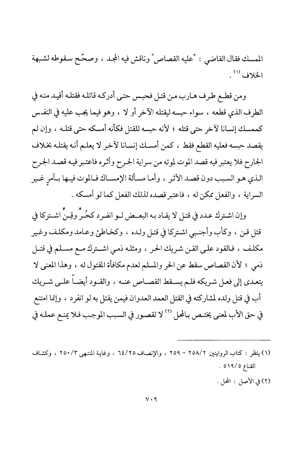 وإن اشترك عدد في قتل لا يقاد به البعض لو انفرد كحُرٍّ وقِنٍّ اشتركا في قتل قن، وكأب وأجنبي اشتركا في قتل ولده، وكخاطئ وعامد ومكلف وغير مكلف، فالقود على القن شريك الحر، ومثله ذمي اشترك مع مسلم في قتل ذمي؛ لأن القصاص سقط عن الحر والمسلم لعدم مكافأة المقتول له، وهذا المعنى لا يتعدى إلى فعل شريكه فلم يسقط القصاص عنه، والقود أيضًا على شريك أب في قتل ولده لمشاركته في القتل العمد العدوان فيمن يقتل به لو انفرد، وإنما امتنع في حق الأب لمعنى يختص بالمحل (¬2) لا لقصور في السبب الموجب فلا يمنع عمله في