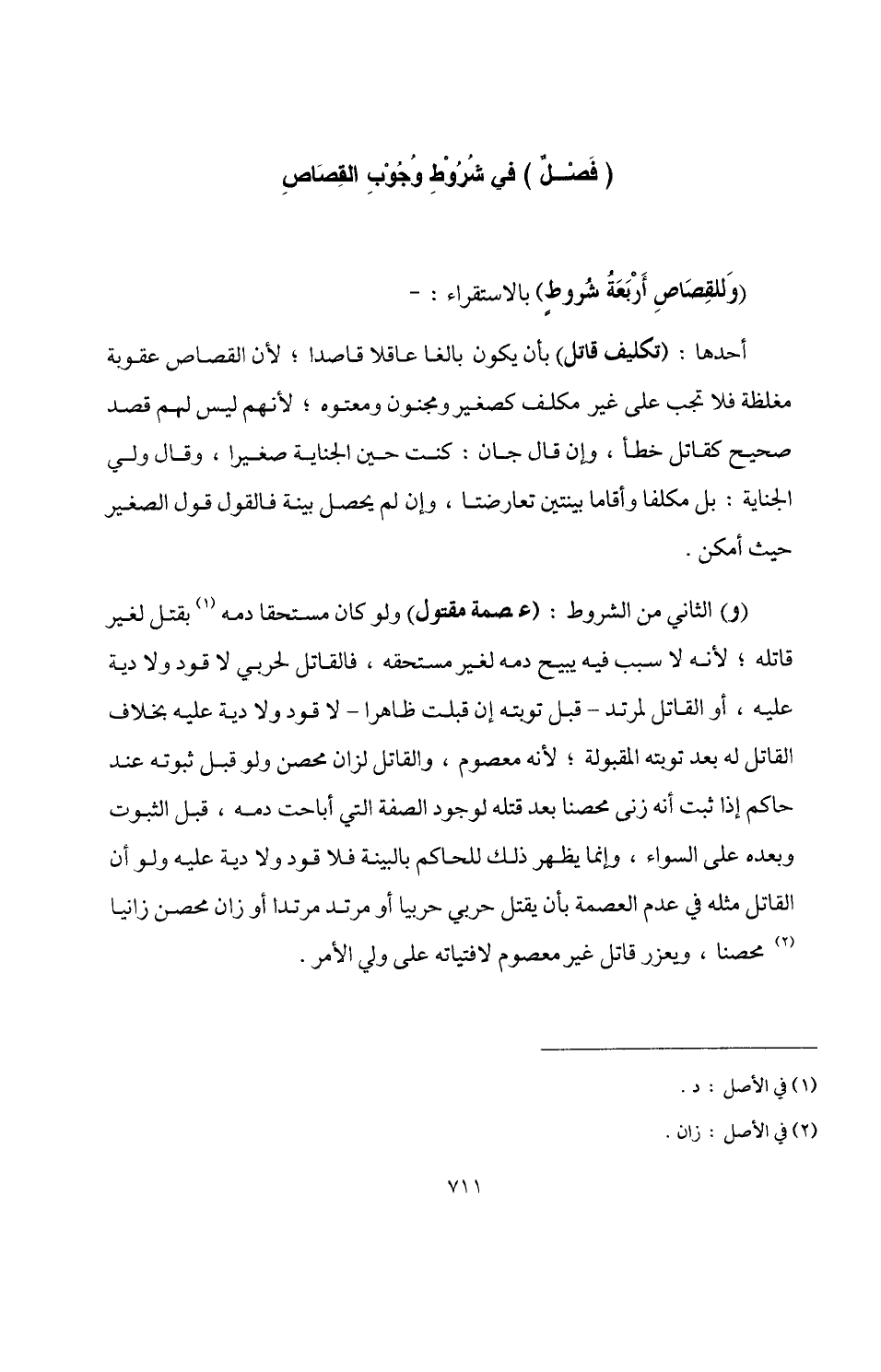 أحدها: (تكليف قاتل) بأن يكون بالغا عاقلا قاصدا؛ لأن القصاص عقوبة مغلظة فلا تجب على غير مكلف كصغير ومجنون ومعتوه؛ لأنهم ليس لهم قصد صحيح كقاتل خطأ، وإن قال جان: كنت حين الجناية صغيرا، وقال ولي الجناية: بل مكلفا وأقاما بينتين تعارضتا، وإن لم يحصل بينة فالقول قول الصغير حيث أمكن.