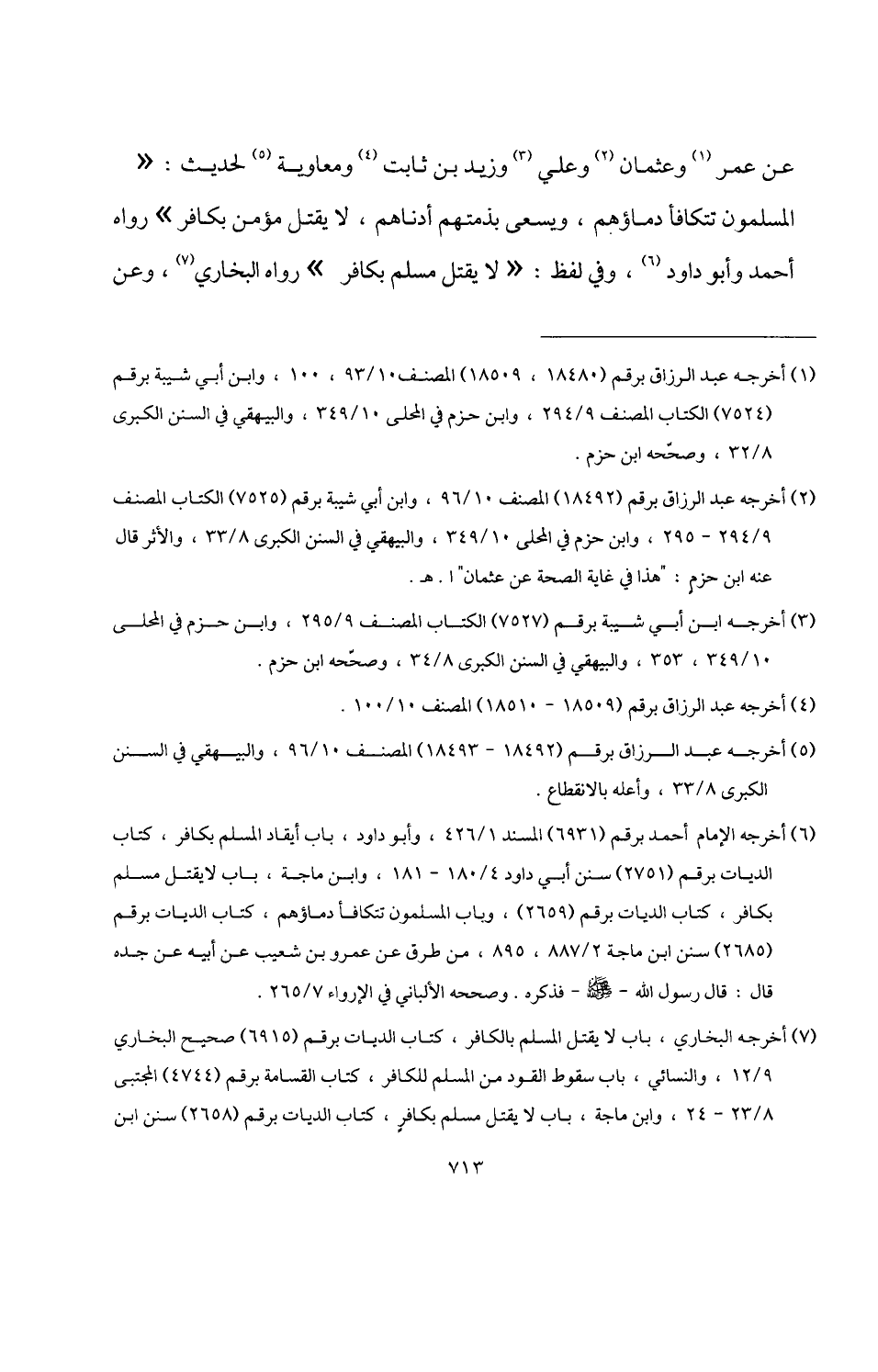 (¬6) أخرجه الإمام أحمد برقم (6931) المسند 1/ 426، وأبو داود، باب أيقاد المسلم بكافر، كتاب الديات برقم (2751) سنن أبي داود 4/ 180 - 181، وابن ماجة، باب لا يقتل مسلم بكافر، كتاب الديات برقم (2659)، وباب المسلمون تتكافأ دماؤهم، كتاب الديات برقم (2685) سنن ابن ماجة 2/ 887، 895، من طرق عن عمرو بن شعيب عن أبيه عن جده قال: قال رسول اللَّه -صلى اللَّه عليه وسلم- فذكره. وصححه الألباني في الإرواء 7/ 265.