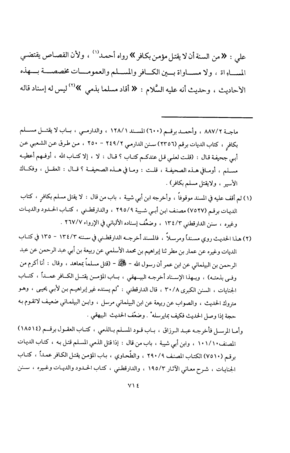 = ماجة 2/ 887، وأحمد برقم (600) المسند 1/ 128، والدارمي، باب لا يقتل مسلم بكافرٍ، كتاب الديات برقم (2356) سنن الدارمي 2/ 249 - 250، من طرق عن الشعبي عن أبي جحيفة قال: (قلت لعلي قل عندكم كتاب؟ قال: لا، إلا كتاب اللَّه، أوفهم أعطيه مسلم، أو ما في هذه الصحيفة، قلت: وما في هذه الصحيفة؟ قال: العقل، وفكاك الأسير، ولا يقتل مسلم بكافر).