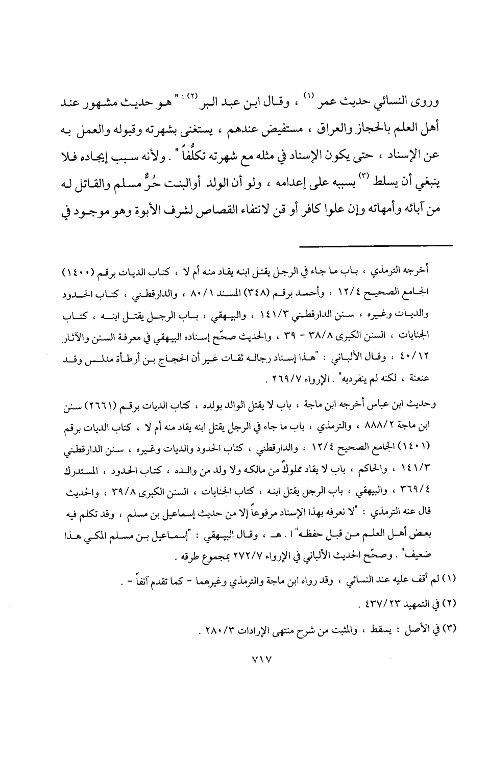 = أخرجه الترمذي، باب ما جاء في الرجل يقتل ابنه يقاد منه أم لا، كتاب الديات برقم (1400) الجامع الصحيح 4/ 12، وأحمد برقم (348) المسند 1/ 80، والدارقطني، كتاب الحدود والديات وغيره، سنن الدارقطني 3/ 141، والبيهقي، باب الرجل يقتل ابنه، كتاب الجنايات، السنن الكبرى 8/ 38 - 39، والحديث صحّح إسناده البيهقي في معرفة السنن والآثار 12/ 40، وقال الألباني: "هذا إسناد رجاله ثقات غير أن الحجاج بن أرطأة مدلس وقد عنعنة، لكنه لم ينفرد به". الإرواء 7/ 269.