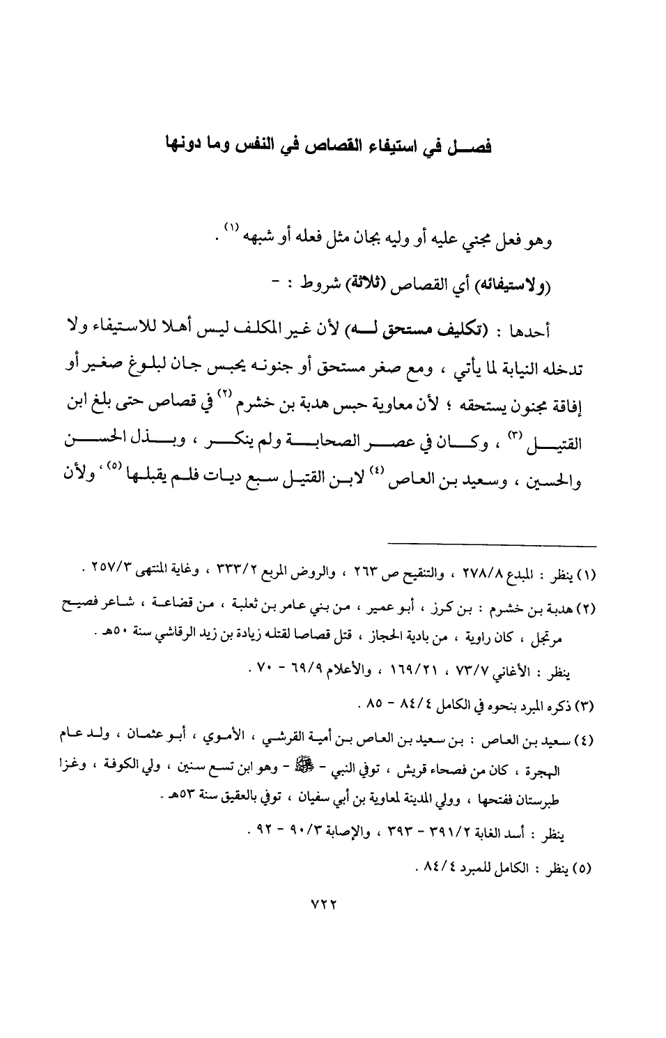 أحدها: (تكليف مستحق له) لأن غير المكلف ليس أهلا للاستيفاء ولا تدخله النيابة لما يأتي، ومع صغر مستحق أو جنونه يحبس جان لبلوغ صغير أو إفاقة مجنون يستحقه؛ لأن معاوية حبس هدبة بن خشرم (¬2) في قصاص حتى بلغ ابن القتيل (¬3)، وكان في عصر الصحابة ولم ينكر، وبذل الحسن والحسين، وسعيد بن العاص (¬4) لابن القتيل سبع ديات فلم يقبلها (¬5) ولأن