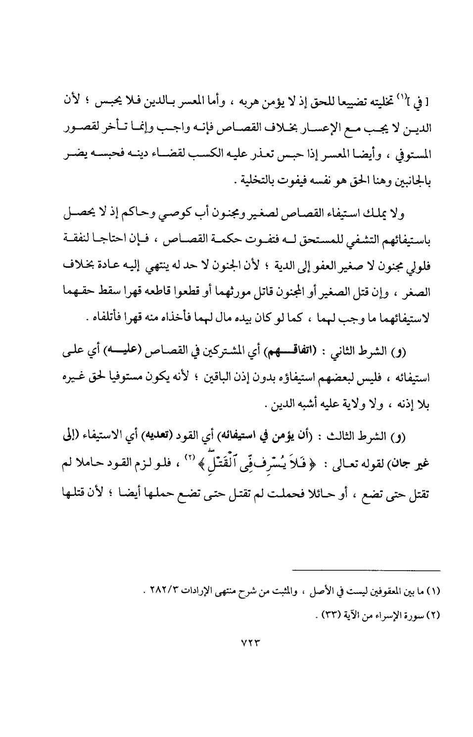(و) الشرط الثالث: (أن يؤمن في استيفائه) أي القود (تعديه) أي الاستيفاء (إلى غير جان) لقوله تعالى: {فَلَا يُسْرِفْ فِي الْقَتْلِ} (¬2)، فلو لزم القود حاملا لم تقتل حتى تضع، أو حائلا فحملت لم تقتل حتى تضع حملها أيضا؛ لأن قتلها