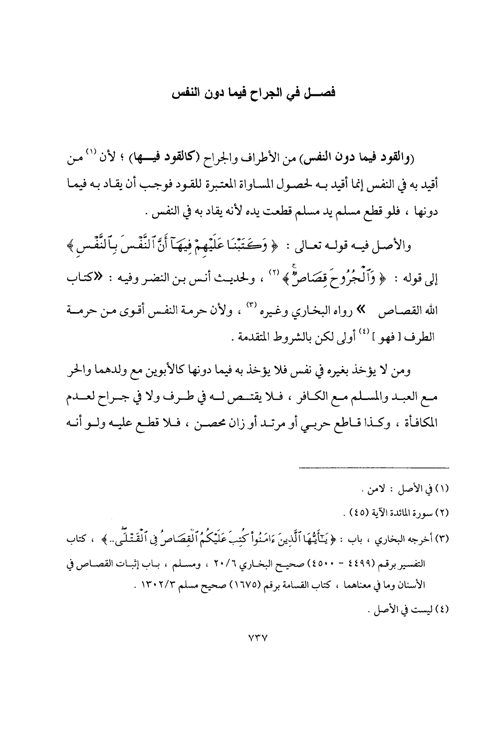 والأصل فيه قوله تعالى: {وَكَتَبْنَا عَلَيْهِمْ فِيهَا أَنَّ النَّفْسَ بِالنَّفْسِ} إلى قوله: {وَالْجُرُوحَ قِصَاصٌ} (¬2)، ولحديث أنس بن النضر وفيه: "كتاب اللَّه القصاص" رواه البخاري وغيره (¬3)، ولأن حرمة النفس أقوى من حرمة الطرف [فهو] (¬4) أولى لكن بالشروط المتقدمة.