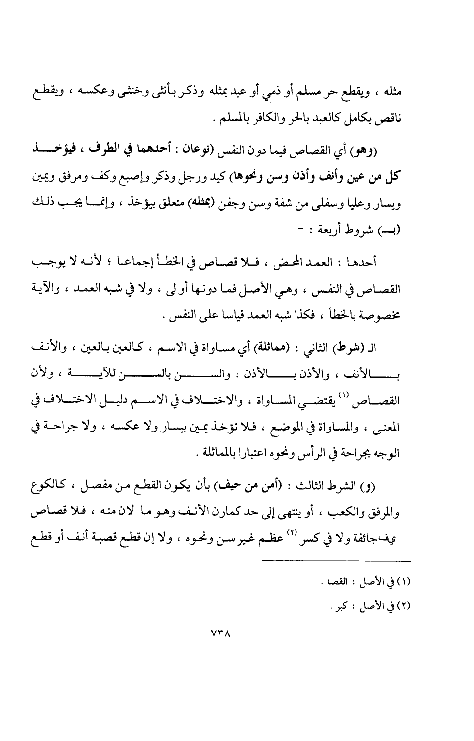 (وهو) أي القصاص فيما دون النفس (نوعان: أحدهما في الطرف، فيؤخذ كل من عين وأنف وأذن وسن ونحوها) كيد ورجل وذكر وإصبع وكف ومرفق ويمين ويسار وعليا وسفلى من شفة وسن وجفن (بمثله) متعلق بيؤخذ، وإنما يجب ذلك (بـ) شروط أربعة: -