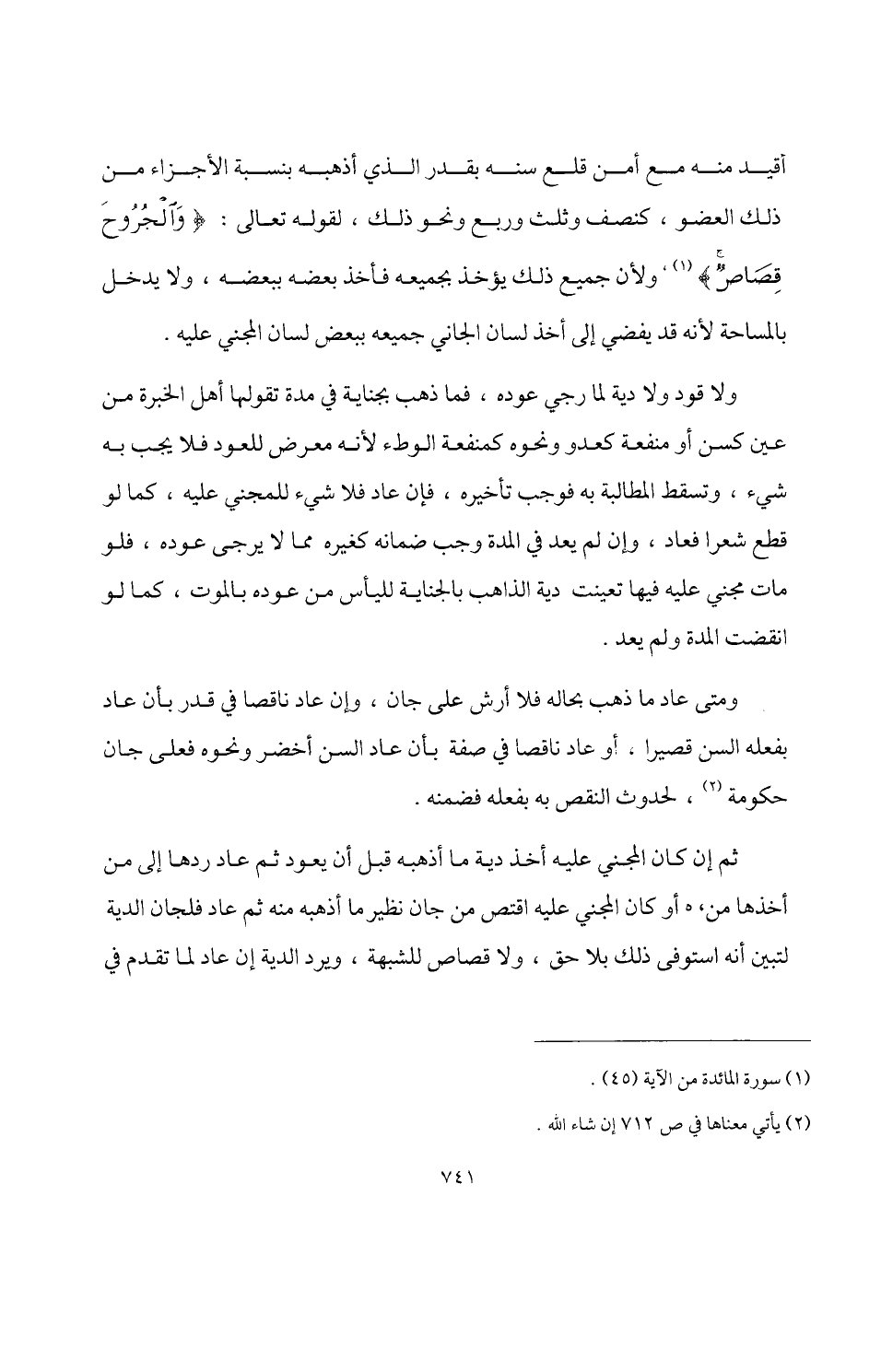 ثم إن كان المجني عليه أخذ دية ما أذهبه قبل أن يعود ثم عاد ردها إلى من أخذها منه، أو كان المجني عليه اقتص من جان نظير ما أذهبه منه ثم عاد فلجان الدية لتبين أنه استوفى ذلك بلا حق، ولا قصاص للشبهة، ويرد الدية إن عاد لما تقدم في