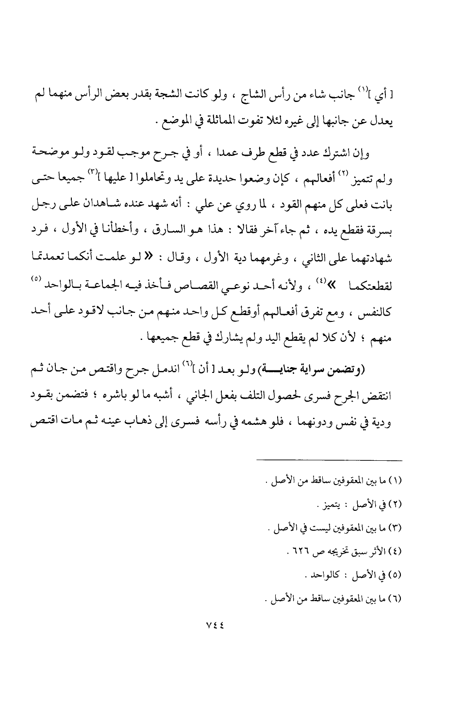 وإن اشترك عدد في قطع طرف عمدا، أو في جرح موجب لقود ولو موضحة ولم تتميز (¬2) أفعالهم، كإن وضعوا حديدة على يد وتحاملوا [عليها] (¬3) جميعا حتى بانت فعلى كل منهم القود، لما روي عن علي: أنه شهد عنده شاهدان على رجل بسرقة فقطع يده، ثم جاء آخر فقالا: هذا هو السارق، وأخطأنا في الأول، فرد شهادتهما على الثاني، وغرمهما دية الأول، وقال: "لو علمت أنكما تعمدتما لقطعتكما"، (¬4)، ولأنه أحد نوعي القصاص فأخذ فيه الجماعة بالواحد (¬5) كالنفس، ومع تفرق أفعالهم أو قطع كل واحد منهم من جانب لا قود على أحد منهم؛ لأن كلا لم يقطع اليد ولم يشارك في قطع جميعها.