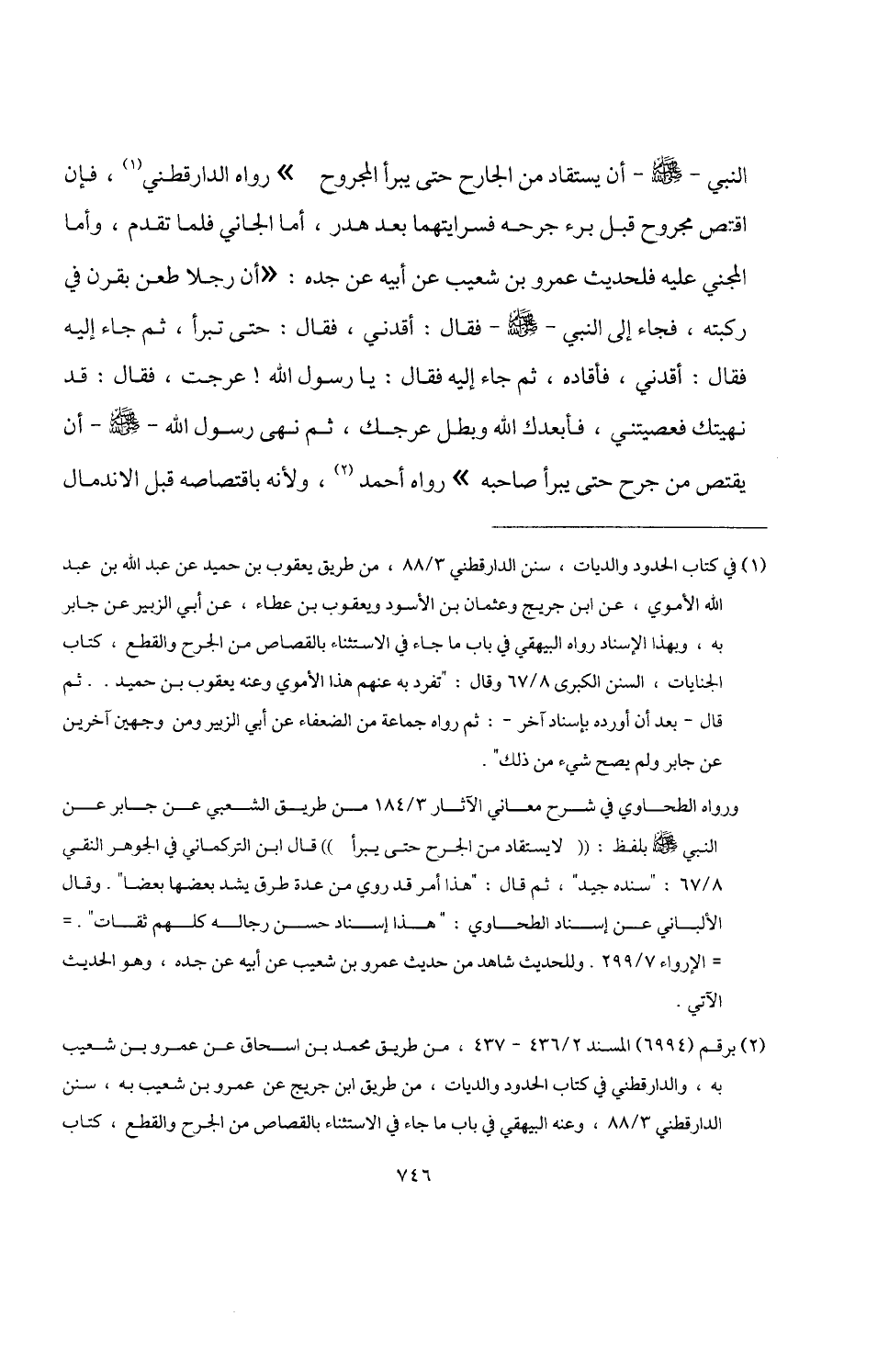 (¬1) في كتاب الحدود والديات، سنن الدارقطني 3/ 88، من طريق يعقوب بن حميد عن عبد اللَّه بن عبد اللَّه الأموي، عن ابن جريج وعثمان بن الأسود ويعقوب بن عطاء، عن أبي الزبير عن جابر به، وبهذا الإسناد رواه البيهقي في باب ما جاء في الاستثناء بالقصاص من الجرح والقطع، كتاب الجنايات، السنن الكبرى 8/ 67 وقال: "تفرد به عنهم هذا الأموي وعنه يعقوب بن حميد .. تم قال -بعد أن أورد بإسناد آخر-: ثم رواه جماعة من الضعفاء عن أبي الزيير ومن وجهين آخرين عن جابر ولم يصح شيء من ذلك".