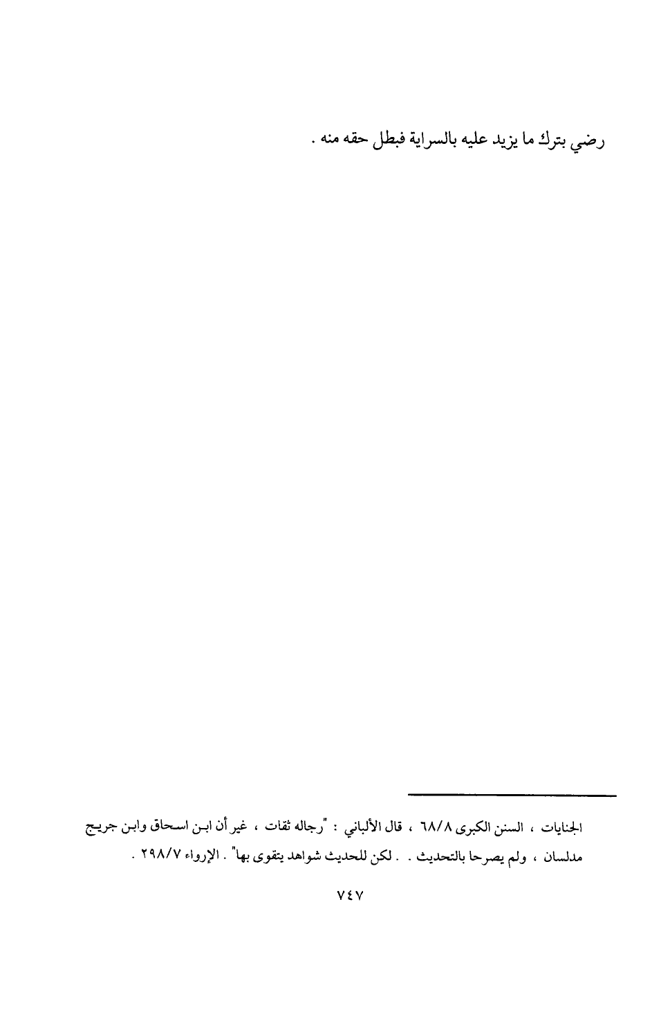 = الجنايات، السنن الكبرى 8/ 68، قال الألباني: "رجاله ثقات، غير أن ابن اسحاق وابن جريج مدلسان، ولم يصرحا بالتحديث. . لكن للحديث شواهد يتقوى بها". الإرواء 7/ 298.