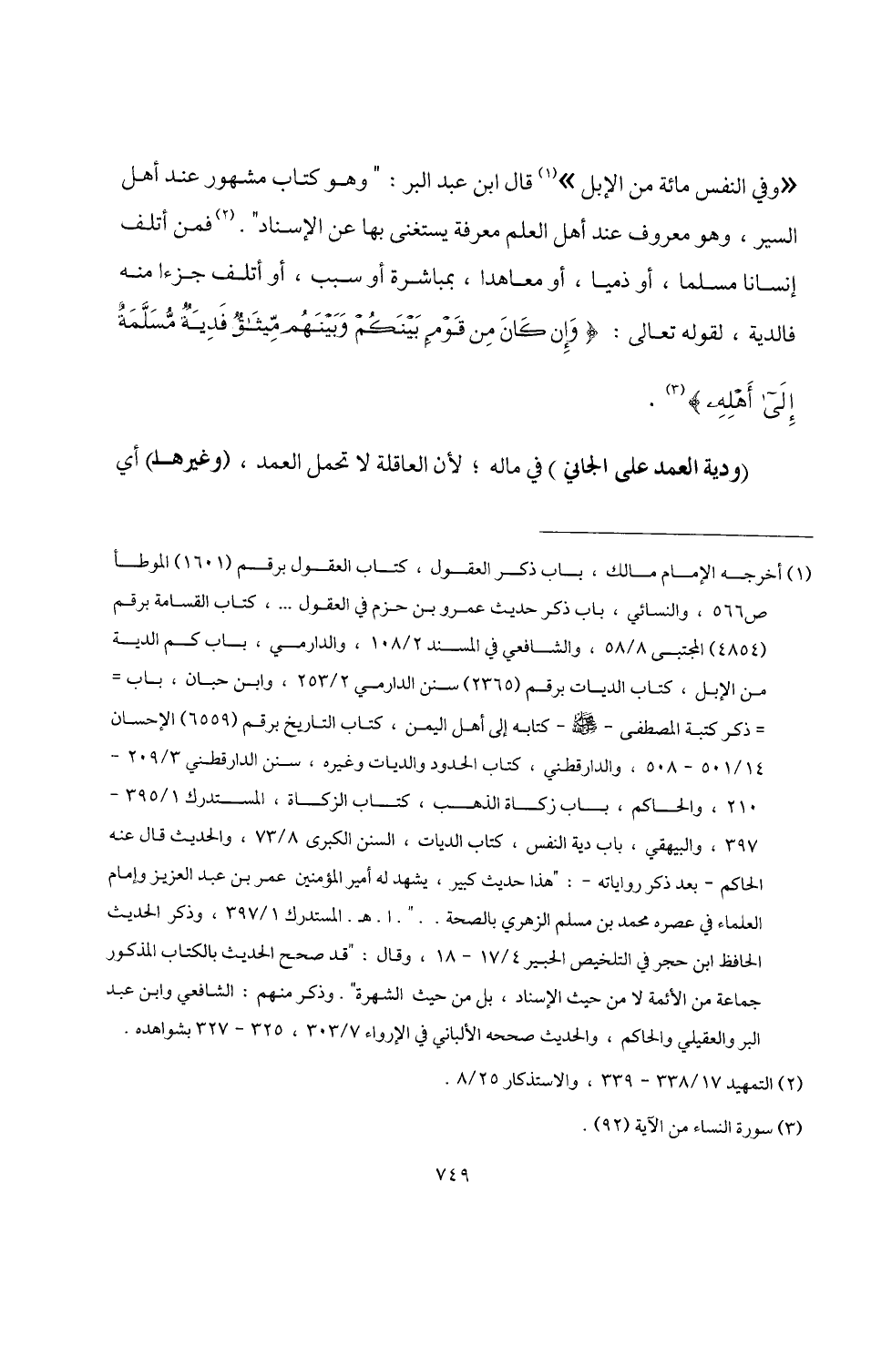 (¬1) أخرجه الإمام مالك، باب ذكر العقول، كتاب العقول برقم (1601) الموطأ ص 566، والنسائي، باب ذكر حديث عمرو بن حزم في العقول. . .، كتاب القسامة برقم (4854) المجتبى 8/ 58، والشافعي في المسند 2/ 108، والدارمي، باب كم الدية من الإبل، كتاب الديات برقم (2365) سنن الدارمي 2/ 253، وابن حبان، باب ذكر كتبة المصطفى -صلى اللَّه عليه وسلم- كتابه إلى أهل اليمن، كتاب التاريخ برقم (6559) الإحسان 14/ 501 - 508، والدارقطني، كتاب الحدود والديات وغيره، سنن الدارقطني 3/ 209 - 210، والحاكم، باب زكاة الذهب، كتاب الزكاة، المستدرك 1/ 395 - 397، والبيهقي، باب دية النفس، كتاب الديات، السنن الكبرى 8/ 73، والحديث قال عنه الحاكم -بعد ذكر رواياته-: "هذا حديث كبير، يشهد له أمير المؤمنين عمر بن عبد العزيز وإمام العلماء في عصره محمد بن مسلم الزهري بالصحة. . ". ا. هـ. المستدرك 1/ 397، وذكر الحديث الحافظ ابن حجر في التلخيص الحبير 4/ 17 - 18، وقال: "قد صحح الحديث بالكتاب المذكور جماعة من الأئمة لا من حيث الإسناد، بل من حيث الشهرة". وذكر منهم: الشافعي وابن عبد البر والعقيلي والحاكم، والحديث صححه الألباني في الإرواء 7/ 303، 325 - 327 بشواهده.