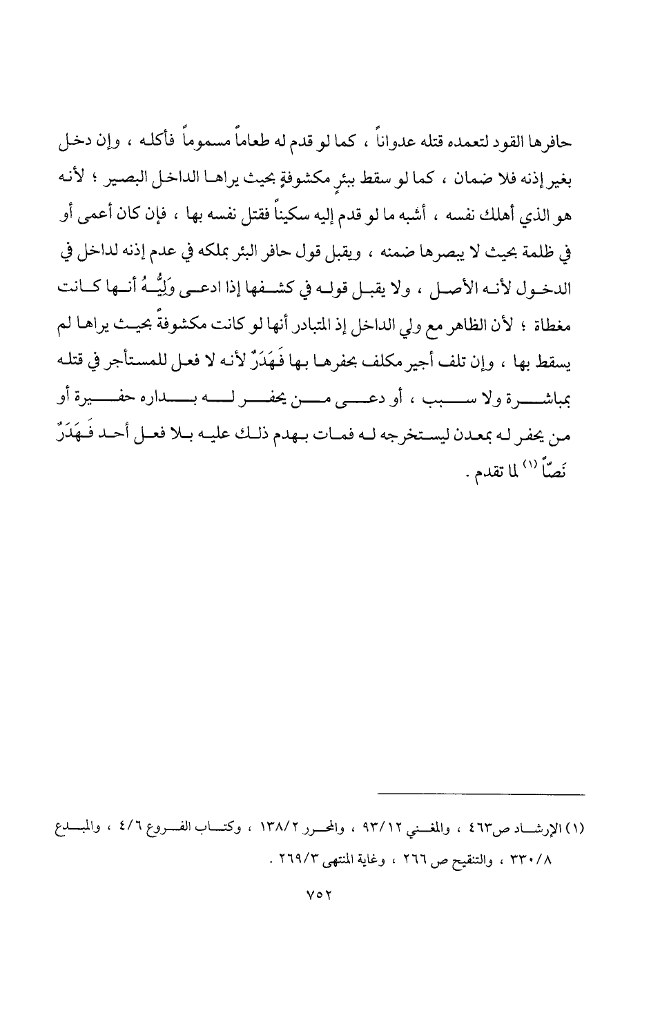 حافرها القود لتعمده قتله عدوانًا، كما لو قدم له طعاما مسمومًا فأكله، وإن دخل بغير إذنه فلا ضمان، كما لو سقط ببئرٍ مكشوفةٍ بحيث يراها الداخل البصير؛ لأنه هو الذي أهلك نفسه، أشبه ما لو قدم إليه سكينًا فقتل نفسه بها، فإن كان أعمى أو في ظلمة بحيث لا يبصرها ضمنه، ويقبل قول حافر البئر بملكه في عدم إذنه لداخل في الدخول لأنه الأصل، ولا يقبل قوله في كشفها إذا ادعى وَليُّهُ أنها كانت مغطاة؛ لأن الظاهر مع ولي الداخل إذ المتبادر أنها لو كانت مكشوفةً بحيث يراها لم يسقط بها، وإن تلف أجير مكلف بحفرها بها فَهَدَرٌ لأنه لا فعل للمستأجر في قتله بمباشرة ولا سبب، أو دعى من يحفر له بداره حفيرة أو من يحفر له بمعدن ليستخرجه له فمات بهدم ذلك عليه بلا فعل أحد فَهَدَرٌ نَصًّا (¬1) لما تقدم.