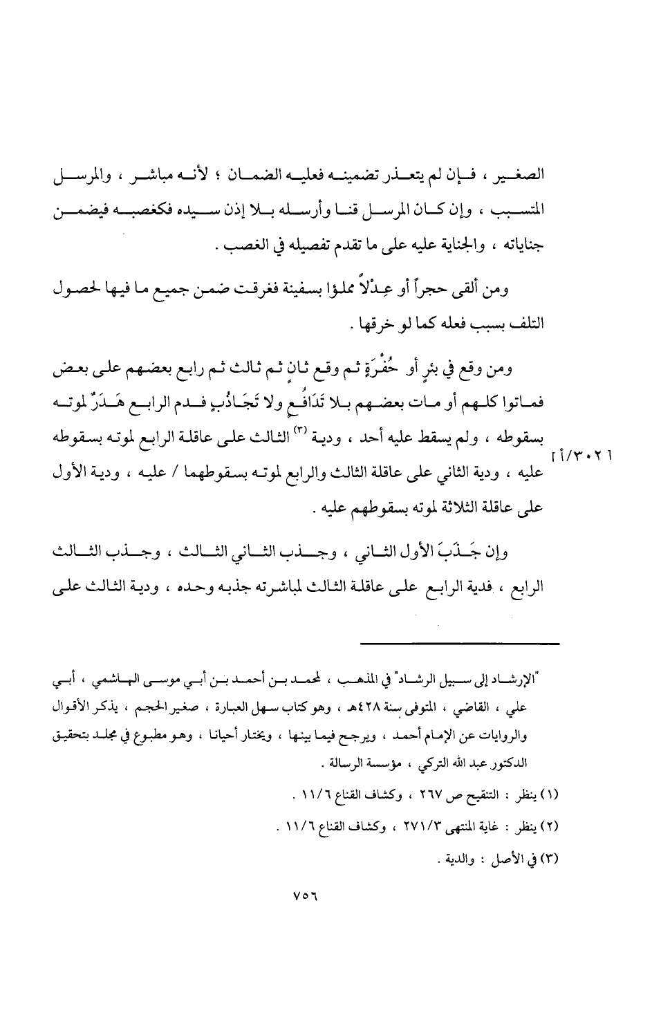 ومن وقع في بئرٍ أو حُفْرَةٍ ثم وقع ثانٍ ثم ثالث ثم رابع بعضهم على بعض فماتوا كلهم أو مات بعضهم بلا تَدَافُعٍ ولا تَجَاذُبٍ فدم الرابع هَدَرٌ لموته بسقوطه، ولم يسقط عليه أحد، ودية (¬1) الثالث على عاقلة الرابع لموته بسقوطه عليه، ودية الثاني على عاقلة الثالث والرابع لموته بسقوطهما عليه، ودية الأول على عاقلة الثلاثة لموته بسقوطهم عليه.