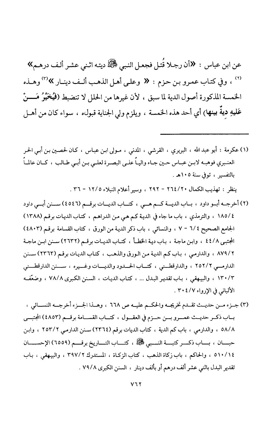 (¬2) أخرجه أبو داود، باب الدية كم هي، كتاب الديات برقم (4546) سنن أبي داود 4/ 185، والترمذي، باب ما جاء في الدية كم هي من الدراهم، كتاب الديات برقم (1388) الجامع الصحيح 4/ 6 - 7، والنسائي، باب ذكر الدية من الورق، كتاب القسامة برقم (4803) المجتبى 8/ 44، وابن ماجة، باب دية الخطأ، كتاب الديات برقم (2632) سنن ابن ماجة 2/ 879، والدارمي، باب كم الدية من الورق والذهب، كتاب الديات برقم (2363) سنن الدارمي 2/ 252، والدارقطني، كتاب الحدود والديات وغيره، سنن الدارقطني 3/ 130، والبيهقي، باب تقدير البدل. . .، كتاب الديات، السنن الكبرى 8/ 78، وضعّفه الألباني في الإرواء 7/ 304.
