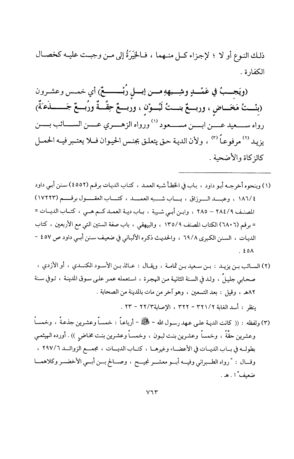 (¬3) ولفظه: "كانت الدية على عهد رسول اللَّه -صلى اللَّه عليه وسلم- أرباعًا: خمسًا وعشرين جذعة، وخمسًا وعشرين حقَّةً، وخمسًا وعشرين بنت لبون، وخمسًا وعشرين بنت مخاضٍ". أورده الهيثمي بطوله في باب الديات في الأعضاء وغيرها، كتاب الديات، مجمع الزوائد 6/ 297، وقال: "رواه الطبراني وفيه أبو معشر نجيح، وصالح بن أبي الأخضر وكلاهما ضعيف" ا. هـ.
