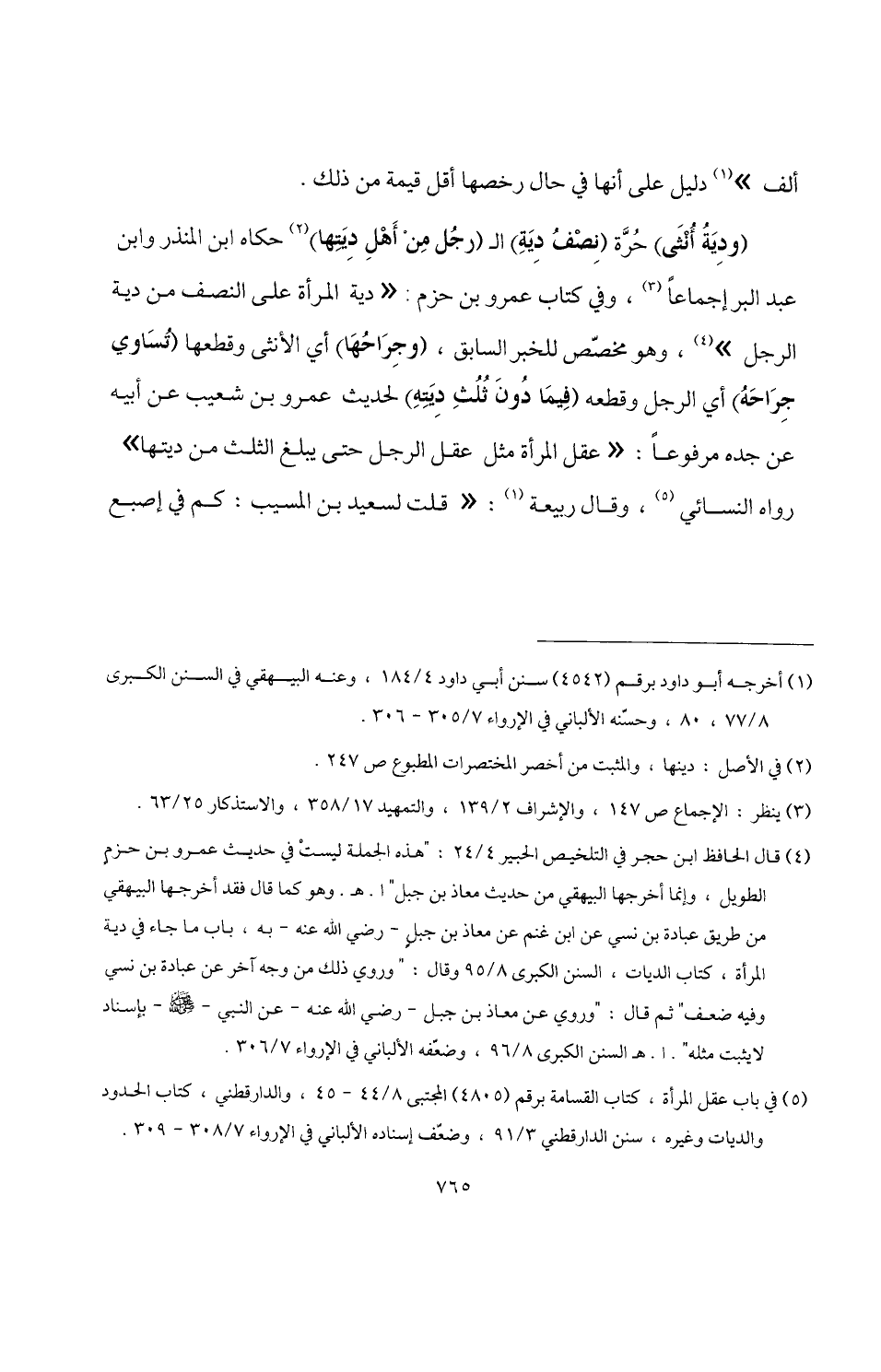 (¬5) في باب عقل المرأة، كتاب القسامة برقم (4805) المجتبى 8/ 44 - 45، والدارقطني، كتاب الحدود والديات وغيره، سنن الدارقطني 3/ 91، وضعّف إسناده الألباني في الإرواء 7/ 308 - 309.