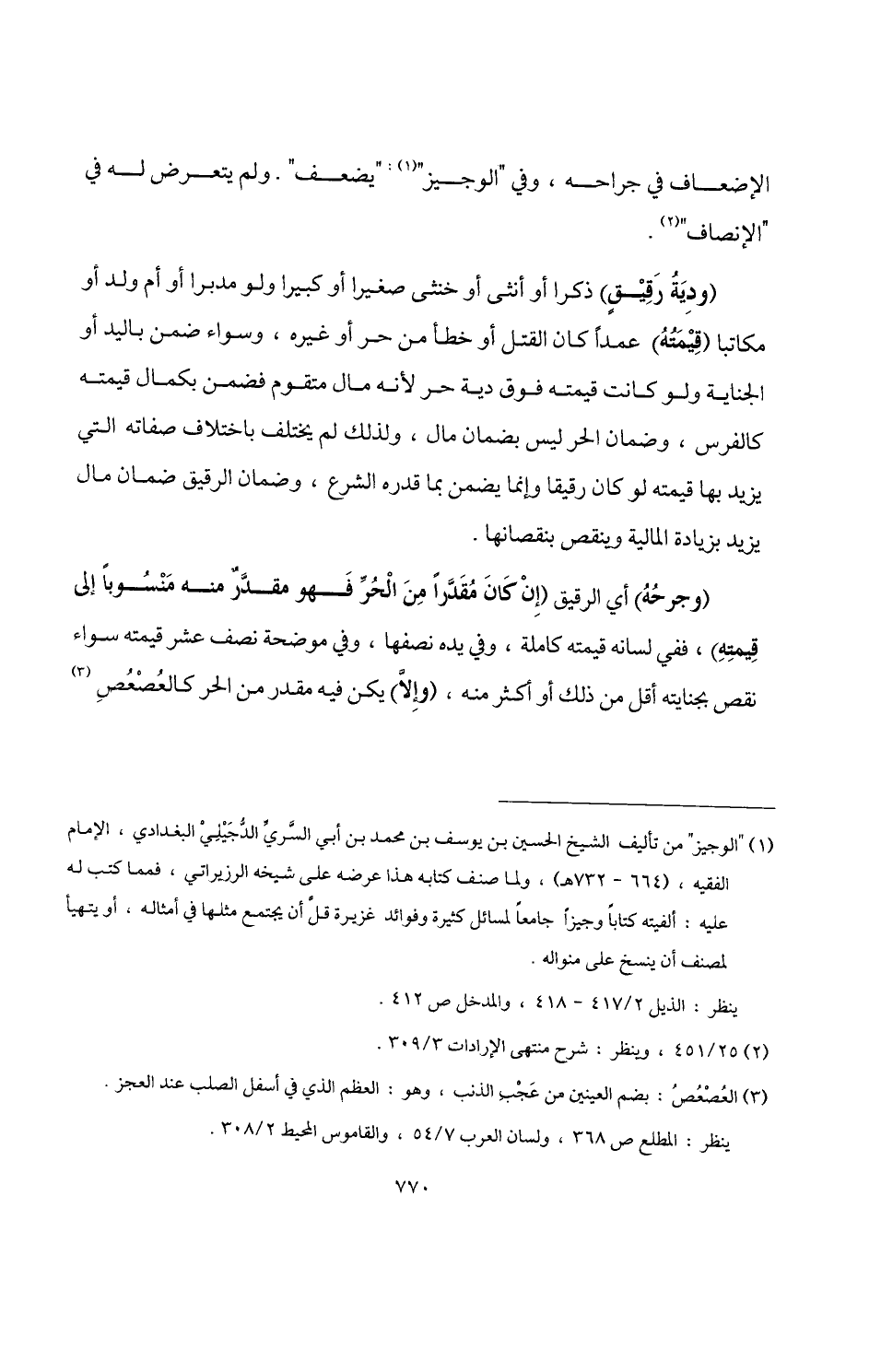 (وجرحُهُ) أي الرقيق (إِنْ كَانَ مُقَدَّرًا مِنَ الْحُرِّ فَهو مقدَّرٌ منه مَنْسُوبًا إلى قِيمتِهِ)، ففي لسانه قيمته كاملة، وفي يده نصفها، وفي موضحة نصف عشر قيمته سواء نقص بجنايته أقل من ذلك أو أكثر منه، (وإِلَّا) يكن فيه مقدر من الحر كالعُصْعُصِ (¬3)
