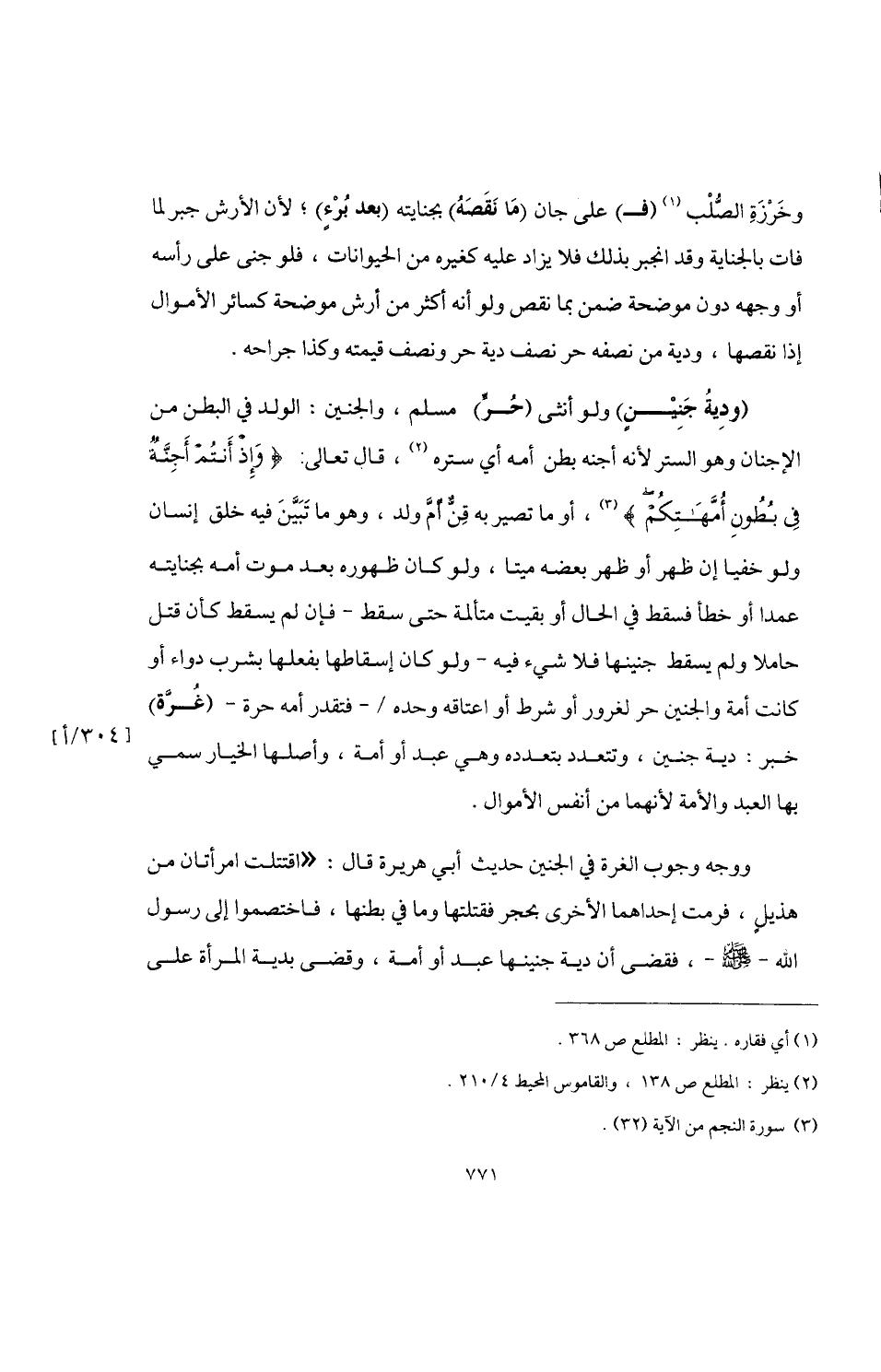 (ودِيةُ جَنِيْنٍ) ولو أنثى (حُرٍّ) مسلم، والجنين: الولد في البطن من الإجنان وهو الستر لأنه أجنه بطن أمه أي ستره (¬2)، قال تعالى: {وَإِذْ أَنْتُمْ أَجِنَّةٌ فِي بُطُونِ أُمَّهَاتِكُمْ} (¬3)، أو ما تصير به قِنٌّ أمَّ ولد، وهو ما تَبَيَّنَ فيه خلق إنسان ولو خفيا إن ظهر أو ظهر بعضه ميتا، ولو كان ظهوره بعد موت أمه بجنايته عمدا أو خطأ فسقط في الحال أو بقيت متالمة حتى سقط -فإن لم يسقط كأن قتل حاملا ولم يسقط جنبنها فلا شيء فيه- ولو كان إسقاطها بفعلها بشرب دواء أو كانت أمة والجنين حر لغرور أو شرط أو اعتاقه وحده -فتقدر أمه حرة- (غُرَّة) خبر: دية جنين، وتتعدد بتعدده وهي عبد أو أمة، وأصلها الخيار سمي بها العبد والأمة لأنهما من أنفس الأموال.