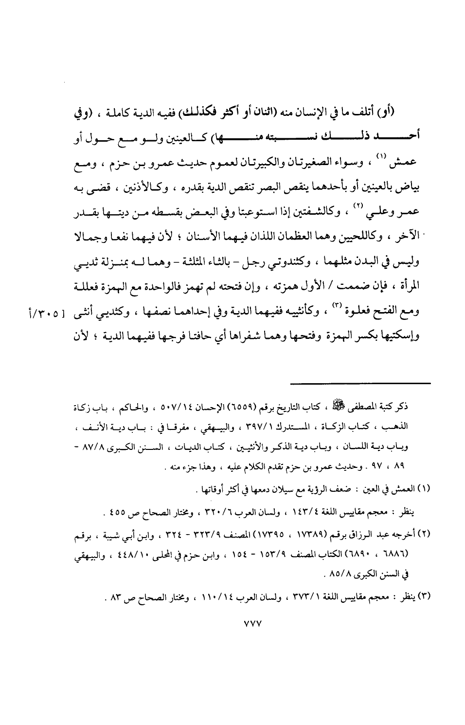 (أو) أتلف ما في الإنسان منه (اثنان أو أكثر فكذلك) ففيه الدية كاملة، (وفي أحد ذلك نسبته منها) كالعينين ولو مع حول أو عمش (¬1)، وسواء الصغيرتان والكبيرتان لعموم حديث عمرو بن حزم، ومع بياض بالعينين أو بأحدهما ينقص البصر تنقص الدية بقدره، وكالأذنين، قضى به عمر وعلي (¬2)، وكالشفتين إذا استوعبتا وفي البعض بقسطه من ديتها بقدر الآخر، وكاللحيين وهما العظمان اللذان فيهما الأسنان؛ لأن فيهما نفعا وجمالا وليس في البدن مثلهما، وكثندوتي رجل -بالثاء المثلثة- وهما له بمنزلة ثديي المرأة، فإن ضممت الأول همزته، وإن فتحته لم تهمز فالواحدة مع الهمزة فعللة ومع الفتح فعلوة (¬3)، وكأنثييه ففيهما الدية وفي إحداهما نصفها، وكثديي أنثى وإسكتيها بكسر الهمزة وفتحها وهما شفراها أي حافتا فرجها ففيهما الدية؛ لأن