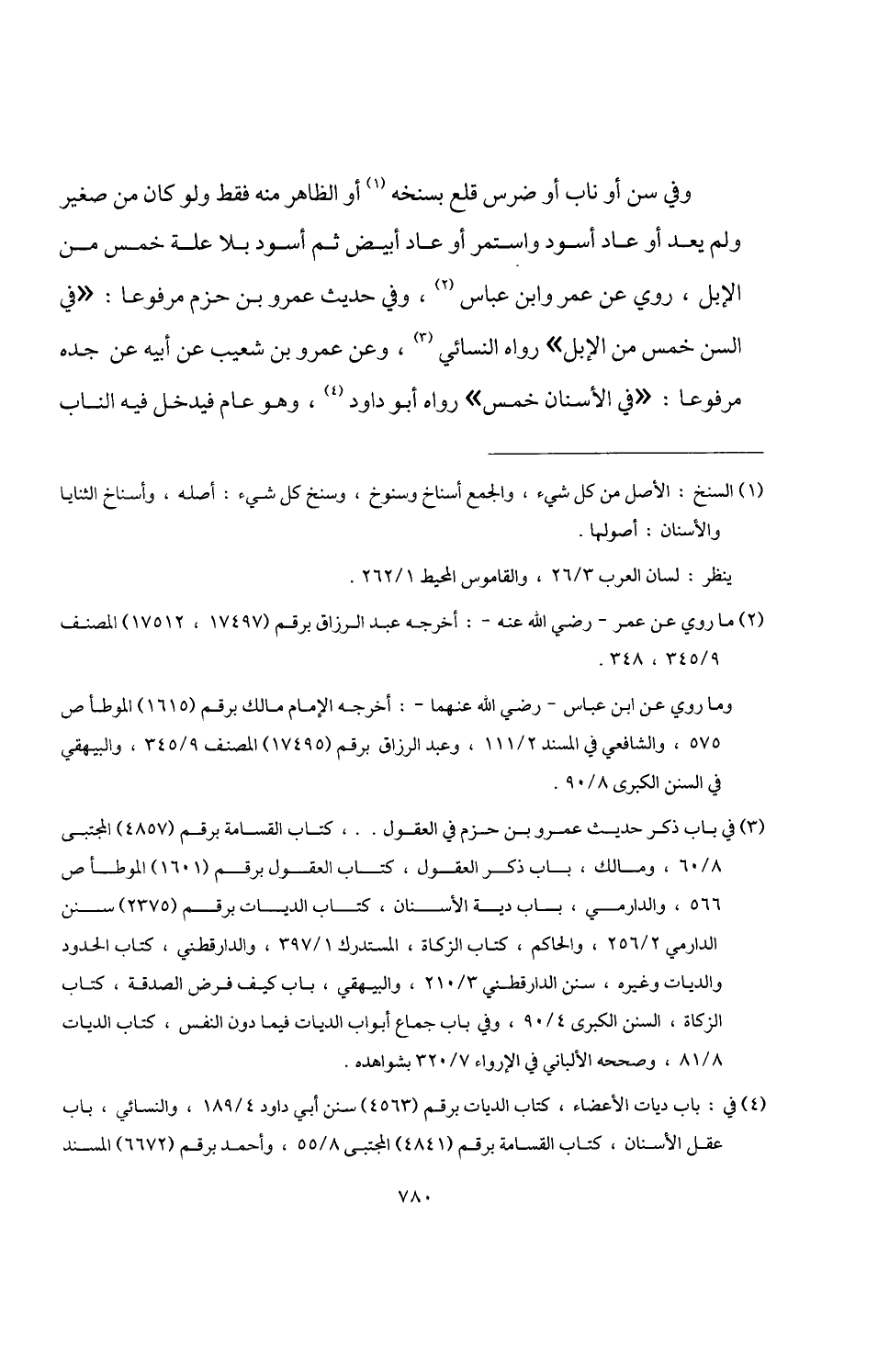 (¬3) في باب ذكر حديث عمرو بن حزم في العقول. .، كتاب القسامة برقم (4857) المجتبى 8/ 60، ومالك، باب ذكر العقول، كتاب العقول برقم (1601) الموطأ ص 566، والدارمي، باب دية الأسنان، كتاب الديات برقم (2375) سنن الدارمي 2/ 256، والحاكم، كتاب الزكاة، المستدرك 1/ 397، والدارقطني، كتاب الحدود والديات وغيره، سنن الدارقطني 3/ 210، والبيهقي، باب كيف فرض الصدقة، كتاب الزكاة، السنن الكبرى 4/ 90، وفي باب جماع أبواب الديات فيما دون النفس، كتاب الديات 8/ 81، وصححه الألباني في الإرواء 7/ 320 بشواهده.