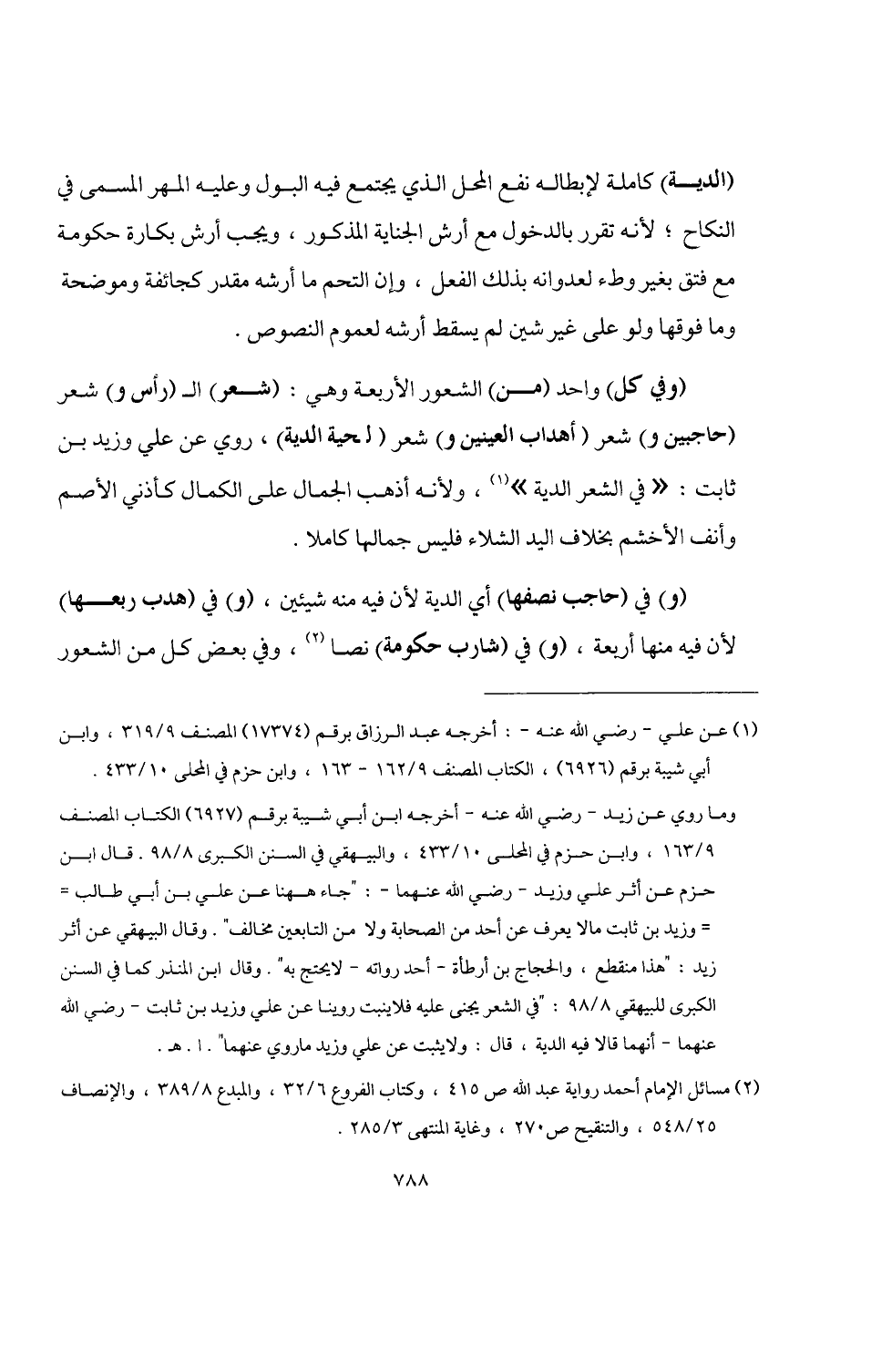 وما روي عن زيد -رضي اللَّه عنه- أخرجه ابن أبي شيبة برقم (6927) الكتاب المصنف 9/ 163، وابن حزم في المحلى 10/ 433، والبيهقي في السنن الكبرى 8/ 98. قال ابن حزم عن أثر علي وزيد -رضي اللَّه عنهما-: "جاء ههنا عن علي بن أبي طالب وزيد بن ثابت ما لا يعرف عن أحد من الصحابة ولا من التابعين مخالف". وقال البيهقي عن أثر زيد: "هذا منقطع، والحجاج بن أرطأة -أحد رواته- لا يحتج به". وقال ابن المنذر كما في السنن الكبرى للبيهقي 8/ 98: "في الشعر يجنى عليه فلا ينبت روينا عن علي وزيد بن ثابت -رضي اللَّه عنهما- أنهما قالا فيه الدية، قال: ولا يثبت عن علي وزيد ما روي عنهما". ا. هـ.