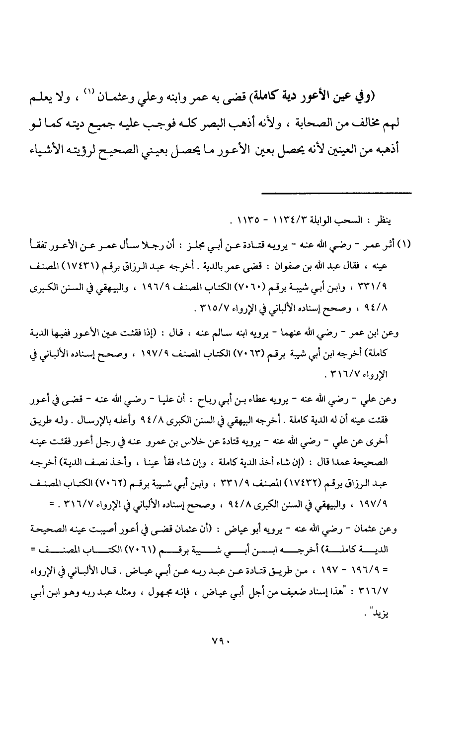 وعن عثمان -رضي اللَّه عنه- يرويه أبو عياض: (أن عثمان قضى في أعور أصيبت عينه الصحيحة الدية كاملة) أخرجه ابن أبي شيبة برقم (7061) الكتاب المصنف 9/ 196 - 197، من طريق قتادة عن عبد ربه عن أبي عياض. قال الألباني في الإرواء 7/ 316: "هذا إسناد ضعيف من أجل أبي عياض، فإنه مجهول، ومثله عبد ربه وهو ابن أبي يزيد".