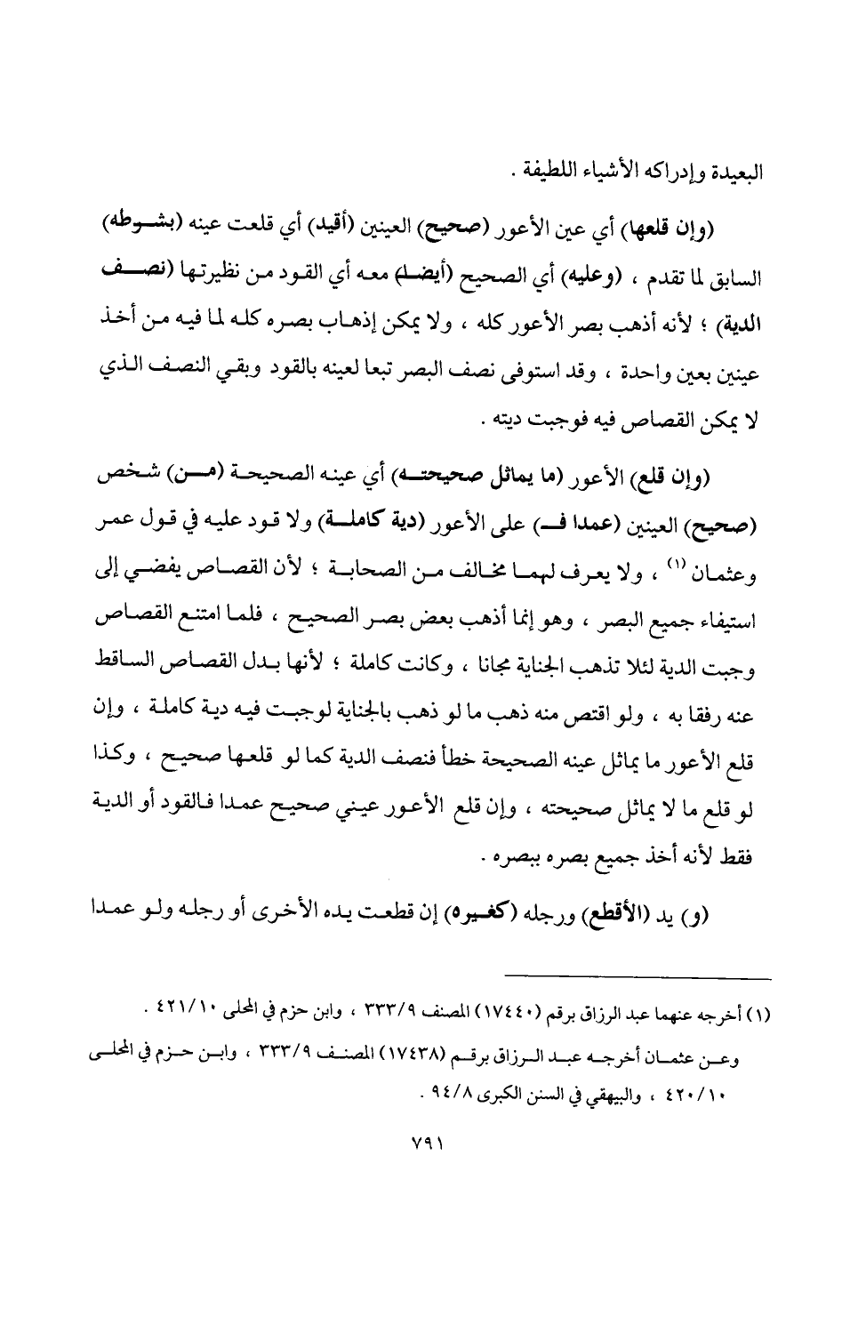 (وإن قلع) الأعور (ما يماثل صحيحته) أي عينه الصحيحة (من) شخص (صحيح) العينين (عمدا فـ) على الأعور (دية كاملة) ولا قود عليه في قول عمر وعثمان (¬1)، ولا يعرف لهما مخالف من الصحابة؛ لأن القصاص يفضي إلى استيفاء جميع البصر، وهو إنما أذهب بعض بصر الصحيح، فلما امتنع القصاص وجبت الدية لئلا تذهب الجناية مجانا، وكانت كاملة؛ لأنها بدل القصاص الساقط عنه رفقا به، ولو اقتص منه ذهب ما لو ذهب بالجناية لوجبت فيه دية كاملة، وإن قلع الأعور ما يماثل عينه الصحيحة خطأ فنصف الدية كما لو قلعها صحيح، وكذا لو قلع ما لا يماثل صحيحته، وإن قلع الأعور عيني صحيح عمدا فالقود أو الدية فقط لأنه أخذ جميع بصره ببصره.