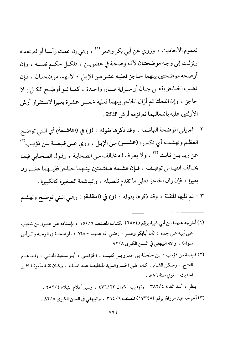 (¬1) أخرجه عنهما ابن أبي شيبة برقم (6874) الكتاب المصنف 9/ 150، بإسناده عن عمرو بن شعبب عن أبيه عن جده: (أن أبا بكر وعمر -رضي اللَّه عنهما- قالا: الموضحة في الوجه والرأس سواء)، وعنه البيهقي في السنن الكبرى 8/ 82.