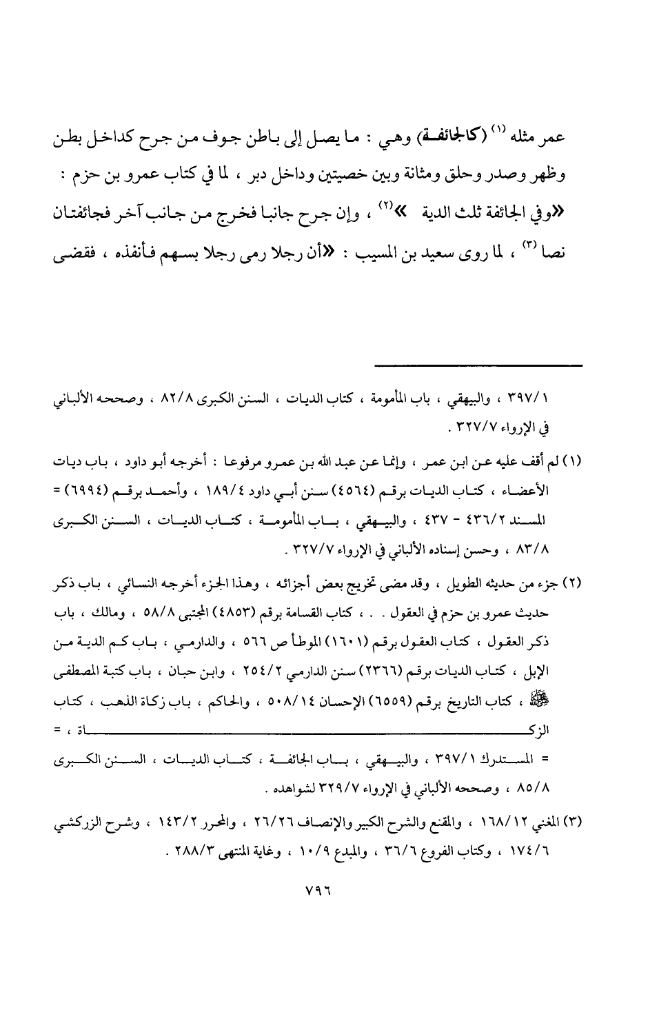 (¬2) جزء من حديثه الطويل، وقد مضى تخريج بعض أجزائه، وهذا الجزء أخرجه النسائي، باب ذكر حديث عمرو بن حزم في العقول. .، كتاب القسامة برقم (4853) المجتبى 8/ 58، ومالك، باب ذكر العقول، كتاب العقول برقم (1601) الموطأ ص 566، والدارمي، باب كم الدية من الإبل، كتاب الديات برقم (2366) سنن الدارمي 2/ 254، وابن حبان، باب كتبة المصطفي -صلى اللَّه عليه وسلم-، كتاب التاريخ برقم (6559) الإحسان 14/ 508، والحاكم، باب زكاة الذهب، كتاب الزكاة، المستدرك 1/ 397، والبيهقي، باب الجائفة: كتاب الديات، السنن الكبرى 8/ 85، وصححه الألباني في الإرواء 7/ 329 لشواهده.
