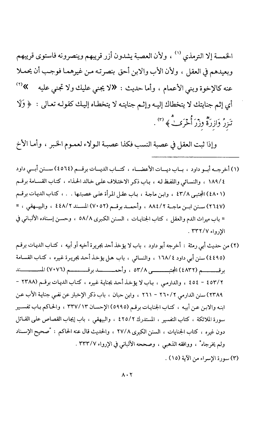 الخمسة إلا الترمذي (¬1)، ولأن العصبة يشدون أزر قريبهم وينصرونه فاستوى قريبهم وبعيدهم في العقل، ولأن الأب والابن أحق بنصرته من غيرهما فوجب أن يحملا عنه كالإخوة وبني الأعمام، وأما حديث: "لا يجني عليك ولا تجني عليه" (¬2) أي إثم جنايتك لا يتخطاك إليه وإثم جنايته لا يتخطاه إليك كقوله تعالى: {وَلَا تَزِرُ وَازِرَةٌ وِزْرَ أُخْرَى} (¬3).