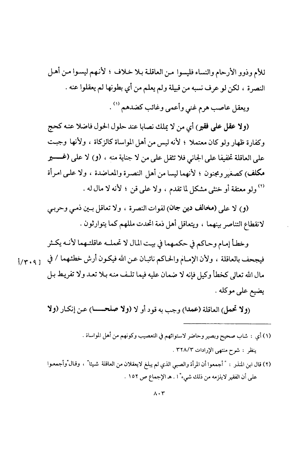 (¬2) قال ابن المنذر: "أجمعوا أن المرأة والصبي الذي لم يبلغ لا يعقلان من العاقلة شيئًا"، وقال "وأجمعوا على أن الفقير لا يلزمه من ذلك شيء" ا. هـ الإجماع ص 152.