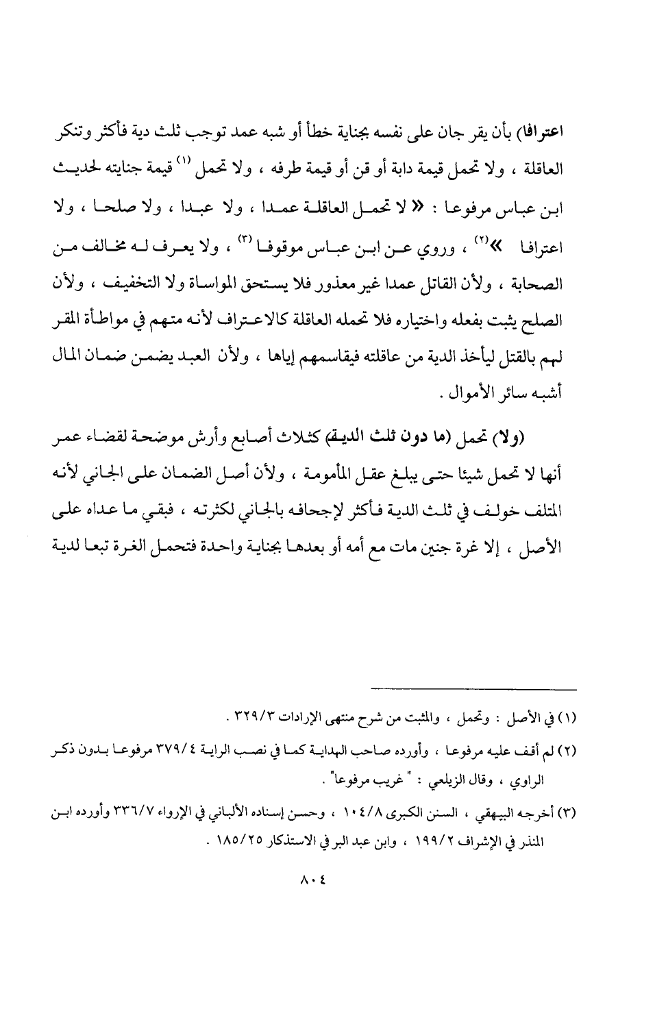 اعترافا) بأن يقر جان على نفسه بجناية خطأ أو شبه عمد توجب ثلث دية فأكثر وتنكر العاقلة، ولا تحمل قيمة دابة أو قن أو قيمة طرفه، ولا تحمل (¬1) قيمة جنايته لحديث ابن عباس مرفوعًا: "لا تحمل العاقلة عمدا، ولا عبدا، ولا صلحا، ولا اعترافا" (¬2)، وروي عن ابن عباس موقوفا (¬3)، ولا يعرف له مخالف من الصحابة، ولأن القاتل عمدا غير معذور فلا يستحق المواساة ولا التخفيف، ولأن الصلح يثبت بفعله واختياره فلا تحمله العاقلة كالاعتراف لأنه متهم في مواطأة المقر لعهم بالقتل ليأخذ الدية من عاقلته فيقاسمهم إياها، ولأن العبد يضمن ضمان المال أشبه سائر الأموال.