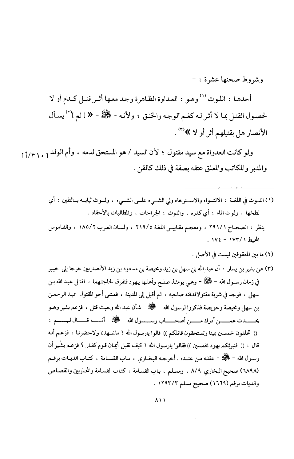 (¬3) عن بشير بن يسار: أن عبد اللَّه بن سهل بن زيد ومحيصة بن مسعود بن زيد الأنصاريين خرجا إلى خيبر في زمان رسول اللَّه -صلى اللَّه عليه وسلم- وهي يومئذ صلح وأهلها يهود فتفرقا لحاجتهما، فقتل عبد اللَّه بن سهل، فوجد في شربة مقتولا فدفنه صاحبه، ثم أقبل إلى المدينة، فمشى أخو المقتول عبد الرحمن بن سهل ومحيصة وحويصة فذكروا لرسول اللَّه -صلى اللَّه عليه وسلم- شأن عبد اللَّه وحيث قتل، فزعم بشير وهو يحدث عمن أدرك من أصحاب رسول اللَّه -صلى اللَّه عليه وسلم- أنه قال لهم: "تحلفون خمسين يمبنا وتستحقون قاتلكم" قالوا يا رسول اللَّه! ما شهدنا ولا حضرنا، فزعم أنه قال: "فتبرئكم يهود بخمسين" فقالوا يا رسول اللَّه! كيف نقبل أيمان قوم كفار؟ فزعم بشير أن رسول اللَّه -صلى اللَّه عليه وسلم- عقله من عنده. أخرجه البخاري، باب القسامة، كتاب الديات برقم (6898) صحيح البخاري 9/ 8، ومسلم، باب القسامة، كتاب القسامة والمحاربين والقصاص والديات برقم (1669) صحيح مسلم 3/ 1293.