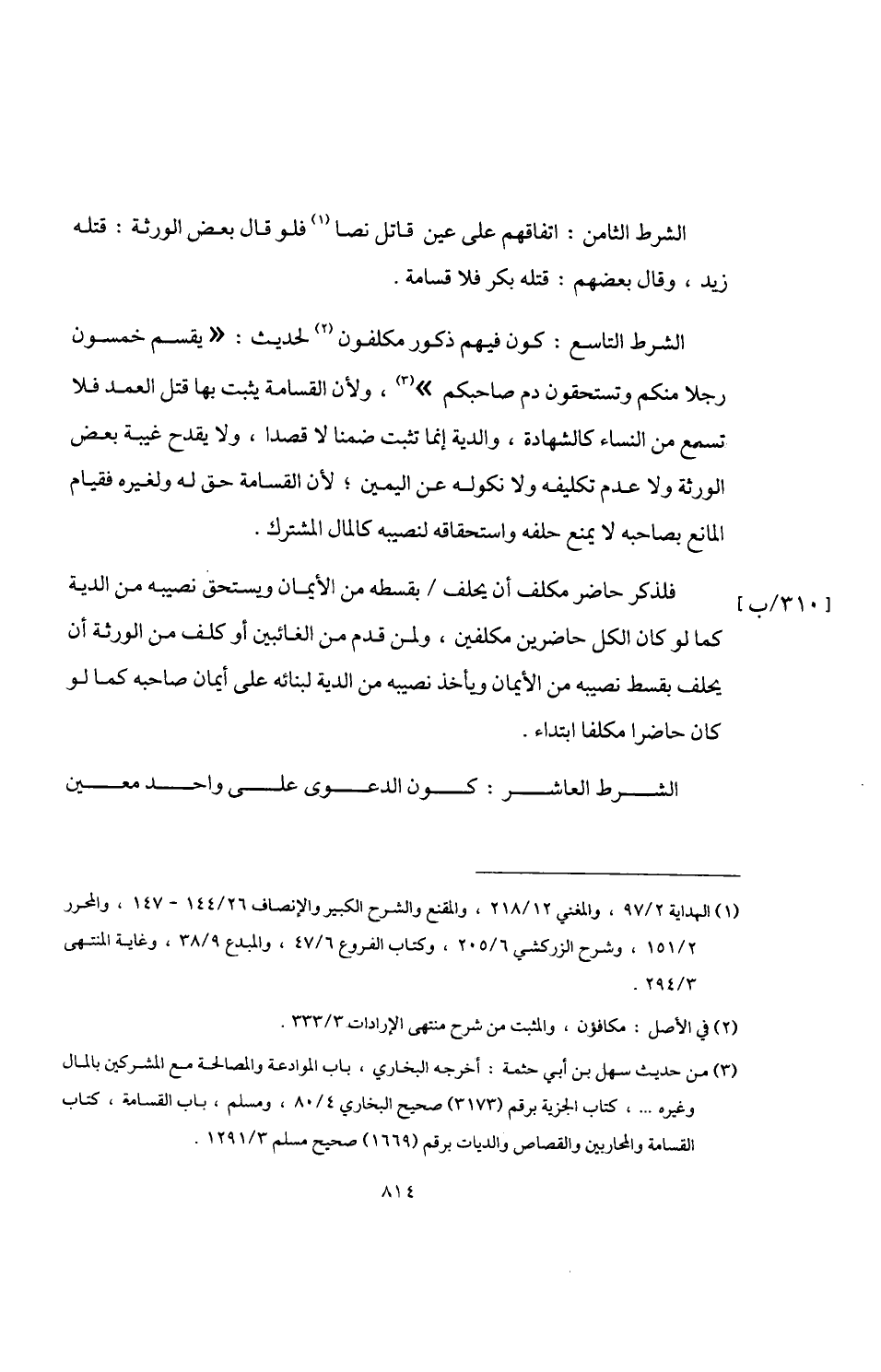 الشرط التاسع: كون فيهم ذكور مكلفون (¬2) لحديث: "يقسم خمسون رجلا منكم وتستحقون دم صاحبكم" (¬3)، ولأن القسامة يثبت بها قتل العمد فلا تسمع من النساء كالشهادة، والدية إنما تثبت ضمنا لا قصدا، ولا يقدح غيبة بعض الورثة ولا عدم تكليفه ولا نكوله عن اليمين؛ لأن القسامة حق له ولغيره فقيام المانع بصاحبه لا يمنع حلفه واستحقاقه لنصيبه كالمال المشترك.