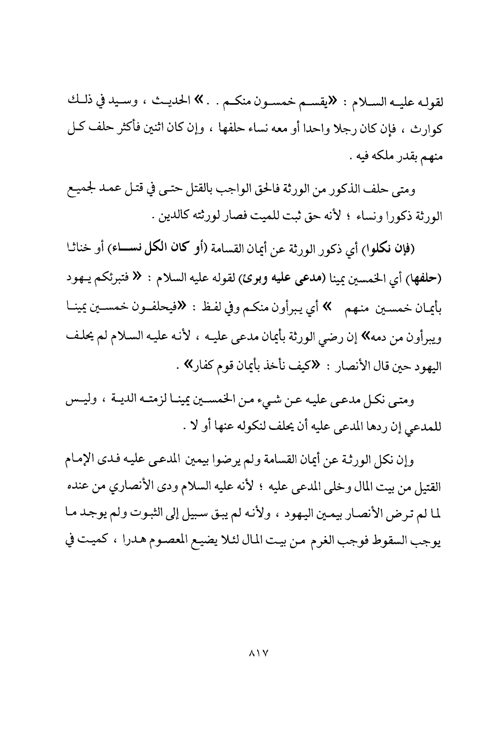 (فإن نكلوا) أي ذكور الورثة عن أيمان القسامة (أو كان الكل نساء) أو خناثا (حلفها) أي الخمسين يمينا (مدعى عليه وبرئ) لقوله عليه السلام: "فتبرئكم يهود بأيمان خمسين منهم" أي يبرأون منكم وفي لفظ: "فيحلفون خمسين يمينا ويبرأون من دمه" إن رضي الورثة بأيمان مدعى عليه، لأنه عليه السلام لم يحلف اليهود حين قال الأنصار: "كيف نأخذ بأيمان قوم كفار".