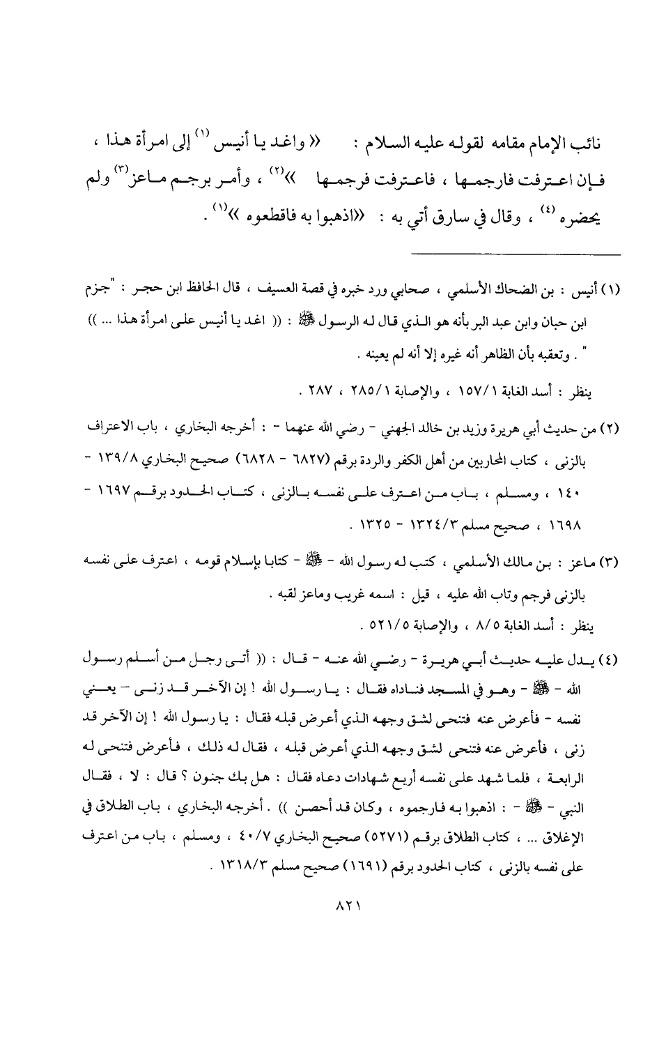(¬2) من حديث أبي هريرة وزيد بن خالد الجهني -رضي اللَّه عنهما-: أخرجه البخاري، باب الاعتراف بالزنى، كتاب المحاربين من أهل الكفر والردة برقم (6827 - 6828) صحيح البخاري 8/ 139 - 140، ومسلم، باب من اعترف على نفسه بالزنى، كتاب الحدود برقم 1697 - 1698، صحيح مسلم 3/ 1324 - 1325.
