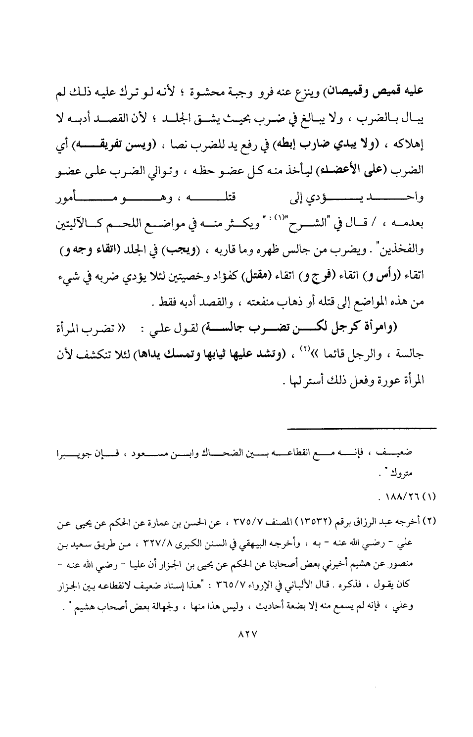 (¬2) أخرجه عبد الرزاق برقم (13532) المصنف 7/ 375، عن الحسن بن عمارة عن الحكم عن يحيى عن علي -رضي اللَّه عنه- به، وأخرجه البيهقي في السنن الكبرى 8/ 327، من طريق سعيد بن منصور عن هشيم أخبرني بعض أصحابنا عن الحكم عن يحيى بن الجزار أن عليا -رضي اللَّه عنه- كان يقول، فذكره. قال الألباني في الإرواء 7/ 365: "هذا إسناد ضعيف لانقطاعه بين الجزار وعلي، فإنه لم يسمع منه إلا بضعة أحاديث، وليس هذا منها، ولجهالة بعض أصحاب هشيم".