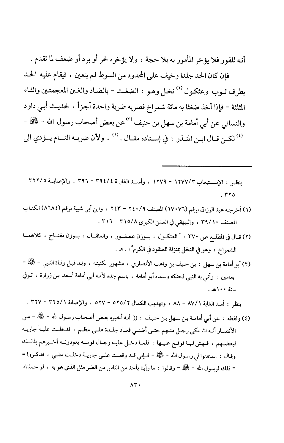 (¬3) ولفظه: عن أبي أمامة بن سهل بن حنيف: "أنه أخبره بعض أصحاب رسول اللَّه -صلى اللَّه عليه وسلم- من الأنصار أنه اشتكى رجل منهم حتى أضني فعاد جلدة على عظم، فدخلت عليه جارية لبعضهم، فهش لها فوقع عليها، فلما دخل عليه رجال قومه يعودونه أخبرهم بذلك وقال: استفتوا لي رسول اللَّه -صلى اللَّه عليه وسلم- فإني قد وقعت على جارية دخلت علي، فذكروا ذلك لرسول اللَّه -صلى اللَّه عليه وسلم- وقالوا: ما رأينا بأحد من الناس من الضر مثل الذي هو به، لو حملناه إليك لتفسخت عظامه، ما هو إلا جلد على عظم، فأمر رسول اللَّه -صلى اللَّه عليه وسلم- أن يأخذوا له مائة شمراخ فبضربوه بها ضربة واحدة". أخرجه أبو داود، باب في إقامة الحد على المريض، كتاب الحدود برقم (4472) سنن أبي داود 4/ 161، والنسائي، باب توجيه الحاكم إلى من أخبرنا أنه زنى، كتاب آداب القضاة برقم (5412) المجتبى 8/ 242 - 243، وابن ماجة، باب الكبير والمريض يجب عليه الحد، كتاب الحدود برقم (2574) سنن ابن ماجة 2/ 859، وأحمد برقم (21428) المسند 6/ 292، والبيهقي، باب الضرير في خلقته لا من مرض يصيب الحد، كتاب الحدود، السنن الكبرى 8/ 230، والحديث أورده الألباني في صحيح سنن أبي داود 3/ 846، وفي صحيح سنن ابن ماجة 2/ 85، وفي صحيح سنن النسائي 3/ 1099.