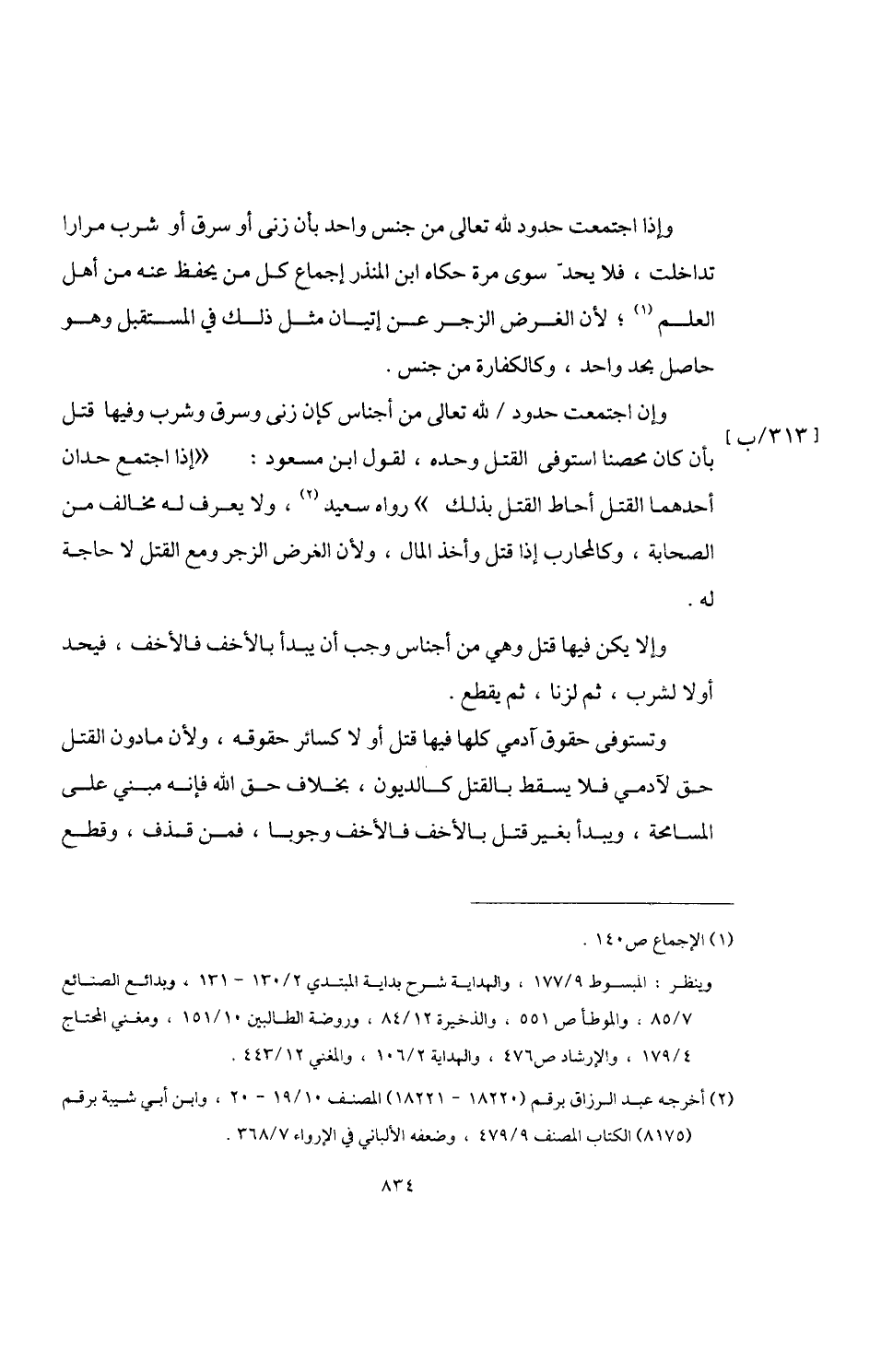 وإن اجتمعت حدود للَّه تعالى من أجناس كإن زنى وسرق وشرب وفيها قتل بأن كان محصنا استوفى القتل وحده، لقول ابن مسعود: "إذا اجتمع حدان أحدهما القتل أحاط القتل بذلك" رواه سعيد (¬2)، ولا يعرف له مخالف من الصحابة، وكالمحارب إذا قتل وأخذ المال، ولأن الغرض الزجر ومع القتل لا حاجة له.