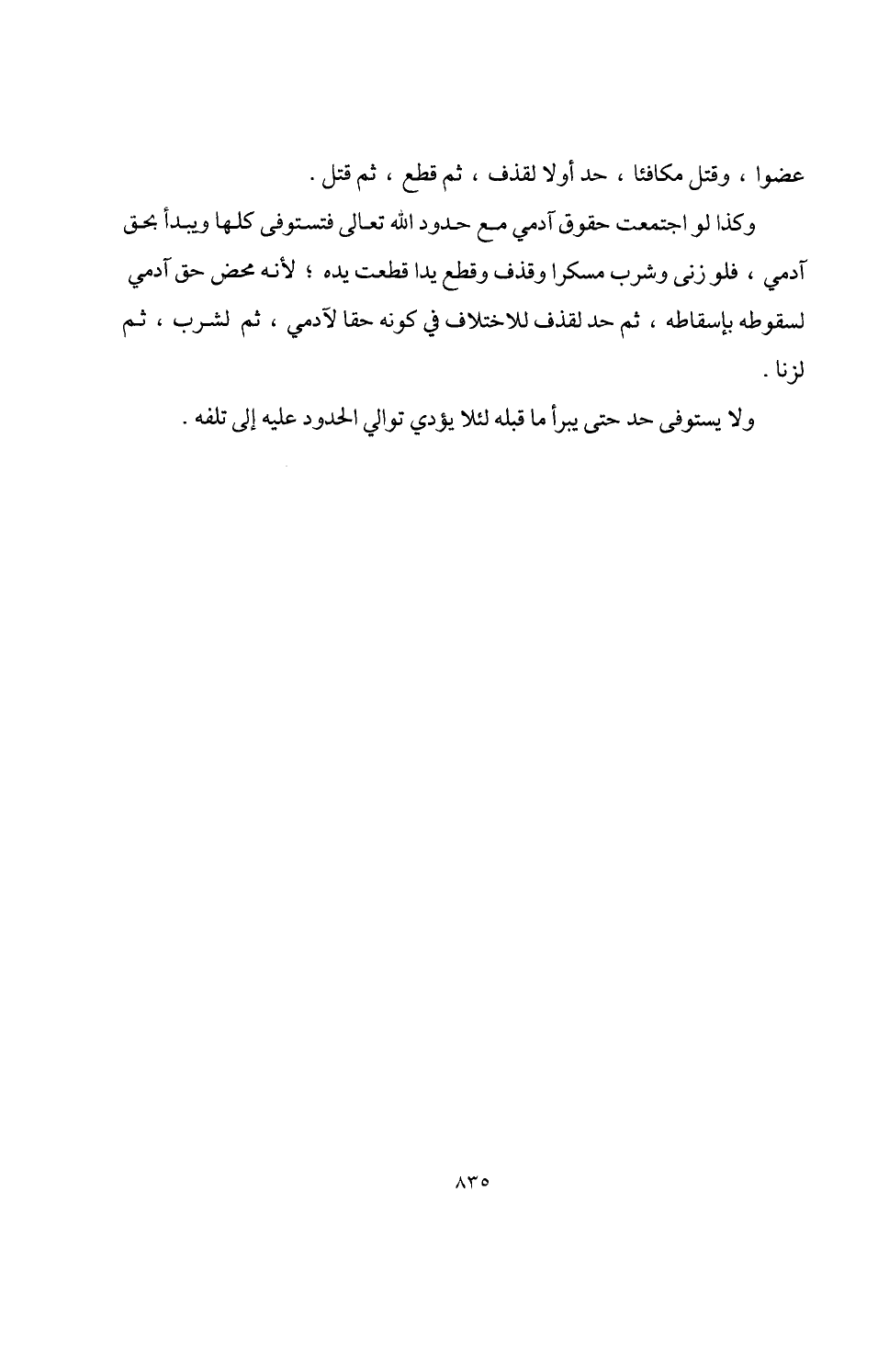 وكذا لو اجتمعت حقوق آدمي مع حدود اللَّه تعالى فتستوفى كلها ويبدأ بحق آدمي، فلو زنى وشرب مسكرا وقذف وقطع يدا قطعت يده؛ لأنه محض حق آدمي لسقوطه بإسقاطه، ثم حد لقذف للاختلاف في كونه حقا لآدمي، ثم لشرب، ثم لزنا.