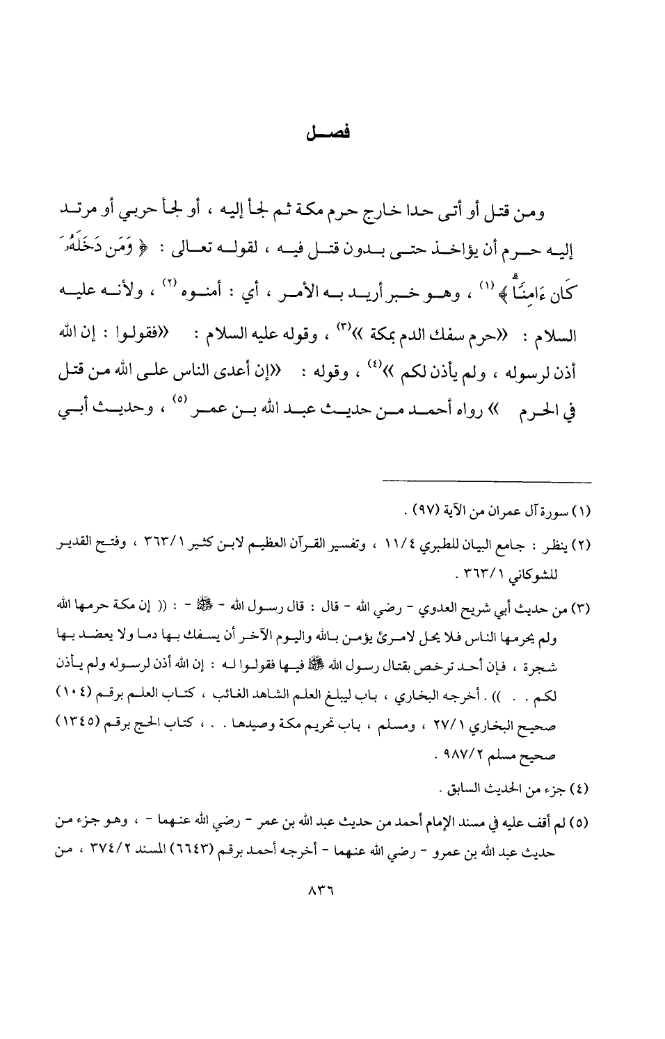 (¬3) من حديث أبي شريح العدوي -رضي اللَّه عنه- قال: قال رسول اللَّه -صلى اللَّه عليه وسلم-: "إن مكة حرمها اللَّه ولم يحرمها الناس فلا يحل لامرئ يؤمن باللَّه واليوم الآخر أن يسفك بها دما ولا يعضد بها شجرة، فإن أحد ترخص بقتال رسول اللَّه -صلى اللَّه عليه وسلم- فيها فقولوا له: إن اللَّه أذن لرسوله ولم يأذن لكم. . ". أخرجه البخاري، باب ليبلغ العلم الشاهد الغائب، كتاب العلم برقم (104) صحيح البخاري 1/ 27، ومسلم، باب تحريم مكة وصيدها. .، كتاب الحج برقم (1345) صحيح مسلم 2/ 987.