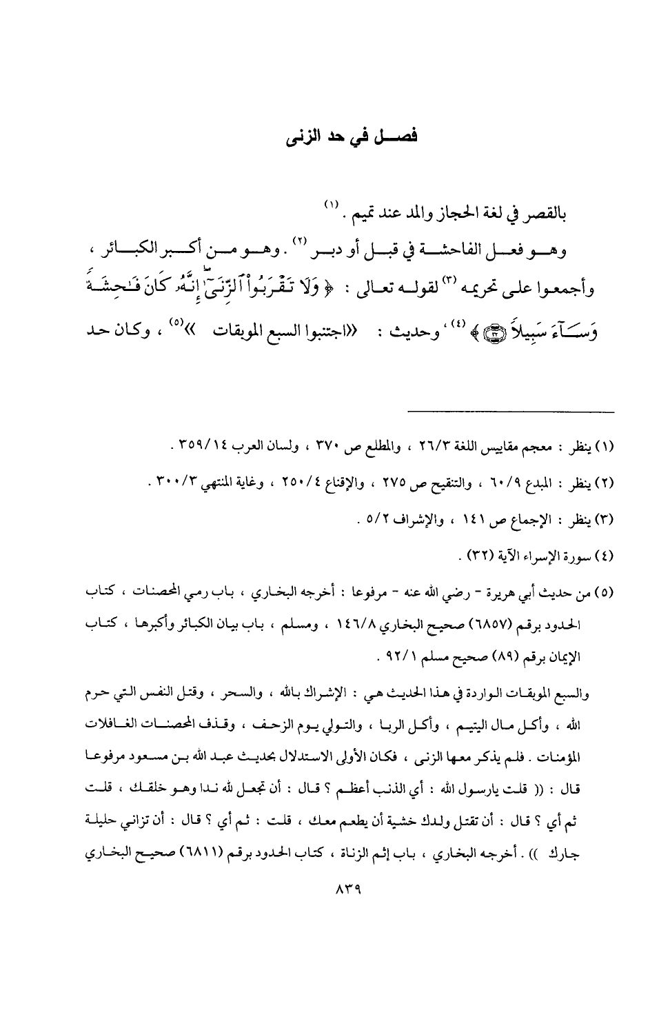 وهو فعل الفاحشة في قبل أو دبر (¬2). وهو من أكبر الكبائر، وأجمعوا على تحريمه (¬3) لقوله تعالى: {وَلَا تَقْرَبُوا الزِّنَا إِنَّهُ كَانَ فَاحِشَةً وَسَاءَ سَبِيلًا (32)} (¬4) , وحديث: "اجتنبوا السبع المويقات" (¬5)، وكان حد