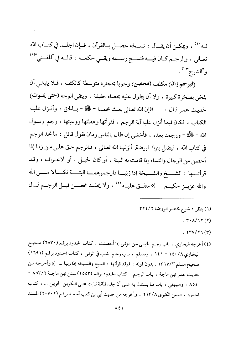 له (¬1)، ويمكن أن يقال: نسخه حصل بالقرآن، فإن الجلد في كتاب اللَّه تعالى، والرجم كان فيه فنسخ رسمه وبقي حكمه، قاله في "المغني" (¬2) و"الشرح" (¬3).