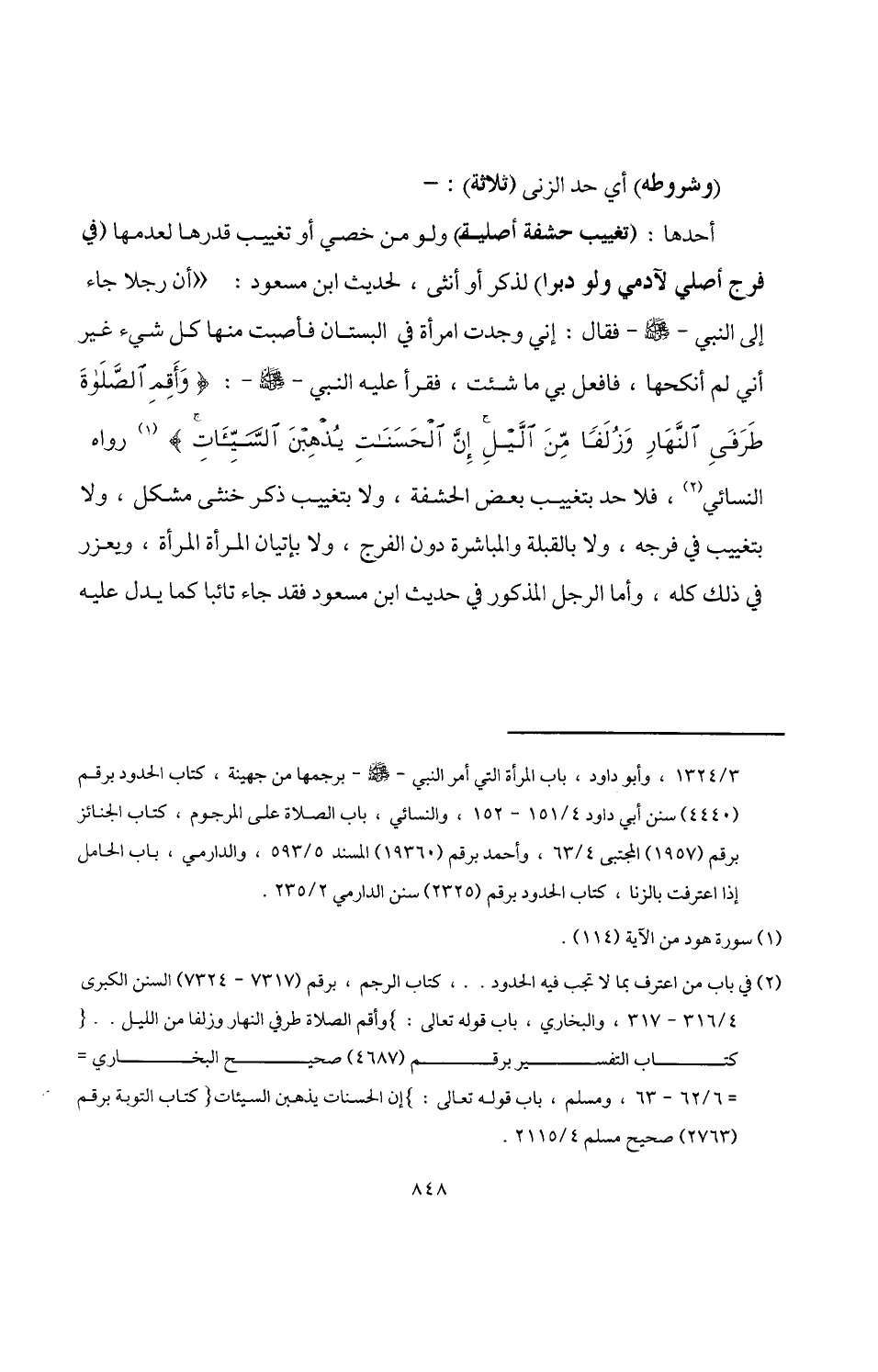 أحدها: (تغييب حشفة أصلية) ولو من خصي أو تغييب قدرها لعدمها (في فرج أصلي لآدمي ولو دبرا) لذكر أو أنثى، لحديث ابن مسعود: "أن رجلا جاء إلى النبي -صلى اللَّه عليه وسلم- فقال: إني وجدت امرأة في البستان فأصبت منها كل شيء غير أني لم أنكحها، فافعل بي ما شئت، فقرأ عليه النبي -صلى اللَّه عليه وسلم-: {وَأَقِمِ الصَّلَاةَ طَرَفَيِ النَّهَارِ وَزُلَفًا مِنَ اللَّيْلِ إِنَّ الْحَسَنَاتِ يُذْهِبْنَ السَّيِّئَاتِ} (¬1) رواه النسائي (¬2)، فلا حد بتغييب بعض الحشفة، ولا بتغييب ذكر خنثى مشكل، ولا بتغييب في فرجه، ولا بالقبلة والباشرة دون الفرج، ولا بإتيان المرأة المرأة، ويعزر في ذلك كله، وأما الرجل المذكور في حديث ابن مسعود فقد جاء تائبا كما يدل عليه