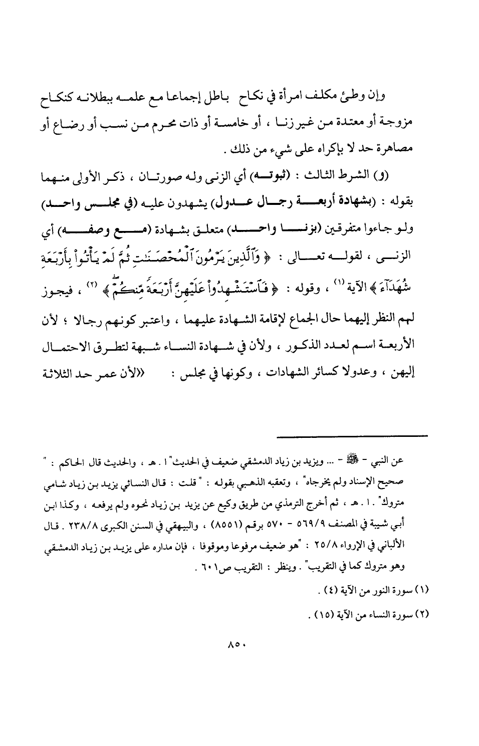 (و) الشرط الثالث: (ثبوته) أي الزنى وله صورتان، ذكر الأولى منهما بقوله: (بشهادة أربعة رجال عدول) يشهدون عليه (في مجلس واحد) ولو جاءوا متفرقين (بزنا واحد) متعلق بشهادة (مع وصفه) أي الزنى، لقوله تعالى: {وَالَّذِينَ يَرْمُونَ الْمُحْصَنَاتِ ثُمَّ لَمْ يَأْتُوا بِأَرْبَعَةِ شُهَدَاء} الآية (¬1)، وقوله: {فَاسْتَشْهِدُوا عَلَيْهِنَّ أَرْبَعَةً مِنْكُمْ} (¬2)، فيجوز لهم النظر إليهما حال الجماع لإقامة الشهادة عليهما، واعتبر كونهم رجالا؛ لأن الأربعة اسم لعدد المذكور، ولأن في شهادة النساء شبهة لتطرق الاحتمال إليهن، وعدولا كسائر الشهادات، وكونها في مجلس: "لأن عمر حد الثلاثة
