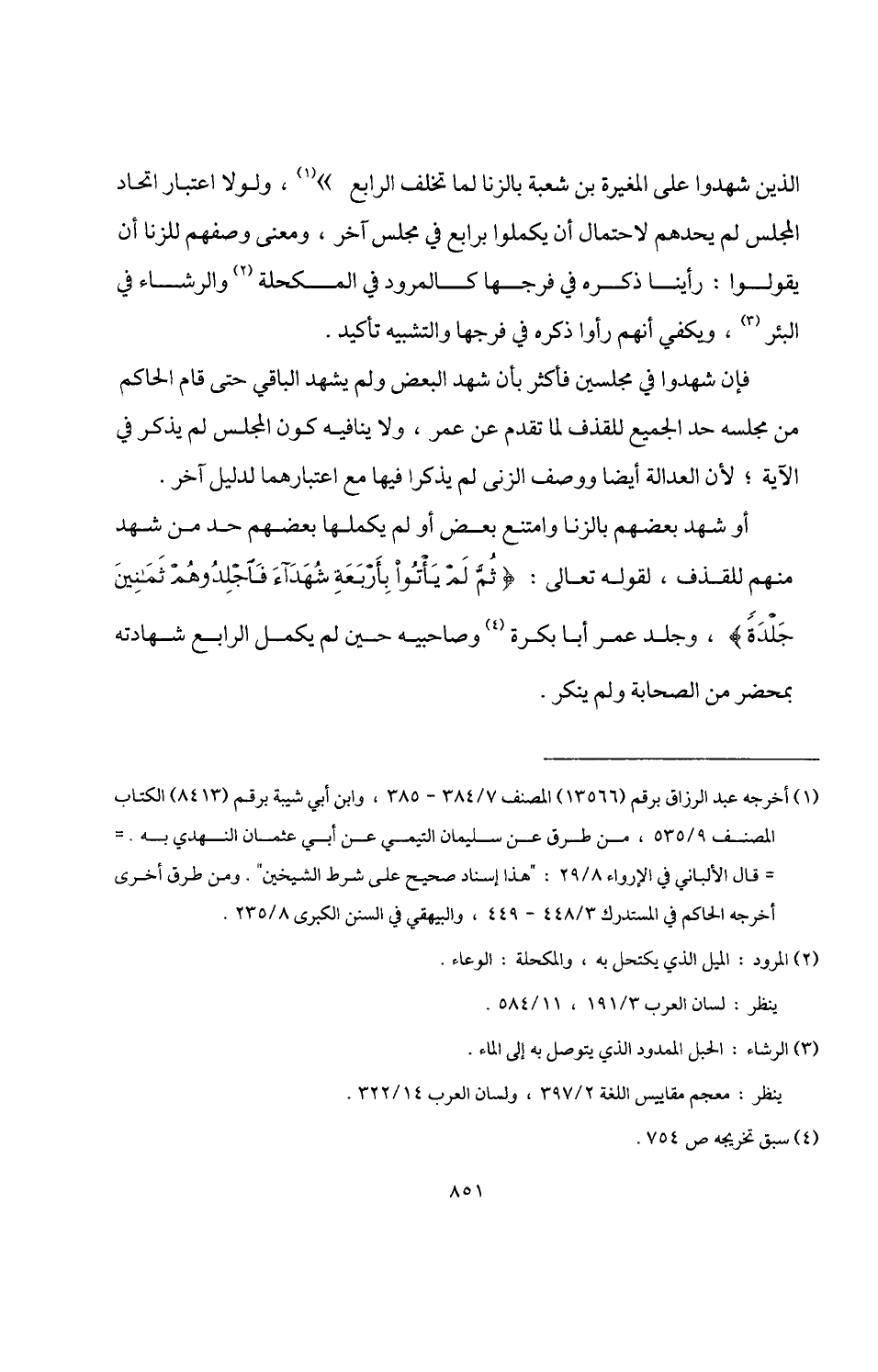 الذين شهدوا على المغيرة بن شعبة بالزنا لما تخلف الرابع" (¬1)، ولولا اعتبار اتحاد المجلس لم يحدهم لاحتمال أن يكملوا برابع في مجلس آخر، ومعنى وصفهم للزنا أن يقولوا: رأينا ذكره في فرجها كالمرود في المكحلة (¬2) والرشاء في البئر (¬3)، ويكفي أنهم رأوا ذكره في فرجها والتشبيه تأكيد.