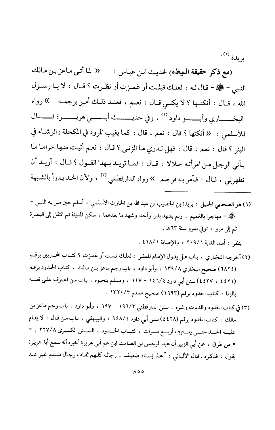 (¬2) أخرجه البخاري، باب هل يقول الإِمام للمقر: لعلك لمست أو غمزت؟ كتاب المحاربين برقم (6824) صحيح البخاري 8/ 139، وأبو داود، باب رجم ماعز بن مالك، كتاب الحدود برقم (4421، 4427) سنن أبي داود 4/ 146 - 147، ومسلم بنحوه، باب من اعترف على نفسه بالزنا، كتاب الحدود برقم (1693) صحيح مسلم 3/ 1320.