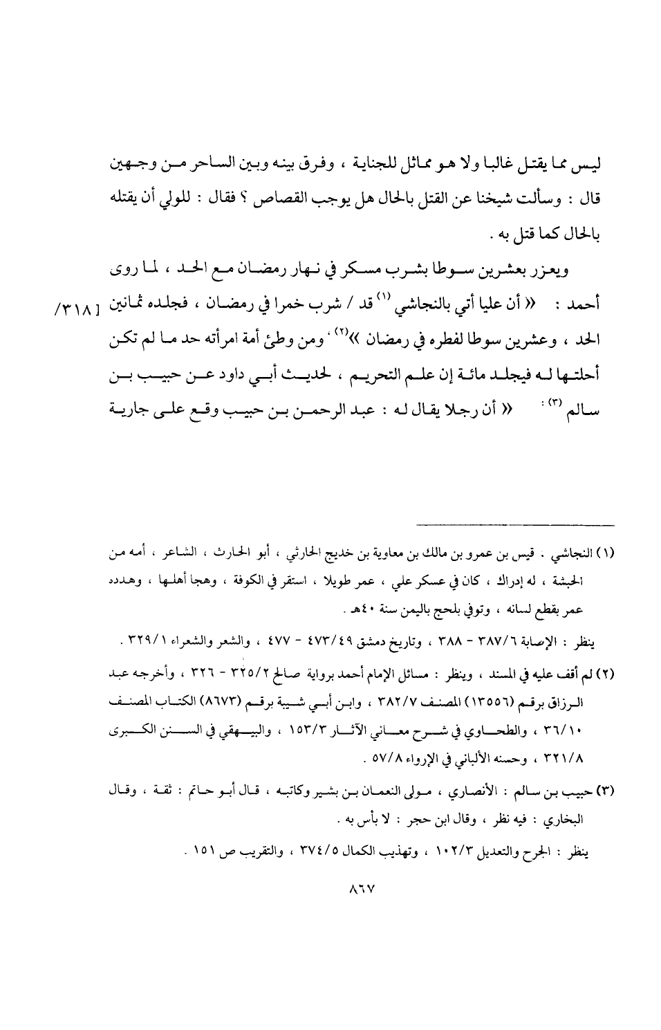 (¬2) لم أقف عليه في المسند، وينظر: مسائل الإِمام أحمد برواية صالح 2/ 325 - 326، وأخرجه عبد الرزاق برقم (13556) المصنف 7/ 382، وابن أبي شيبة برقم (8673) الكتاب المصنف 10/ 36، والطحاوي في شرح معاني الآثار 3/ 153، والبيهقي في السنن الكبرى 8/ 321، وحسنه الألباني في الإرواء 8/ 57.