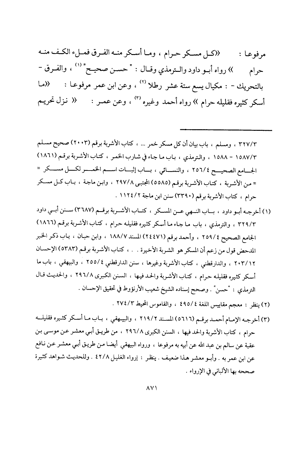 (¬1) أخرجه أبو داود، باب النهي عن المسكر، كتاب الأشربة برقم (3687) سنن أبي داود 3/ 329، والترمذي، باب ما جاء ما أسكر كثيره فقليله حرام، كتاب الأشربة برقم (1866) الجامع الصحيح 4/ 259، وأحمد برقم (24471) المسند 7/ 188، وابن حبان، باب ذكر الخبر المدحض قول من زعم أن المسكر هو الشربة الأخيرة. .، كتاب الأشربة برقم (5383) الإحسان 12/ 203, والدارقطني، كتاب الأشربة وغيرها، سنن الدارقطني 4/ 255، والبيهقي، باب ما أسكر كثيره فقليله حرام، كتاب الأشربة والحد فيها، السنن الكبرى 8/ 296، والحديث قال الترمذي: "حسن". وصحح إسناده الشيخ شعيب الأرنؤوط في تحقيق الإحسان.