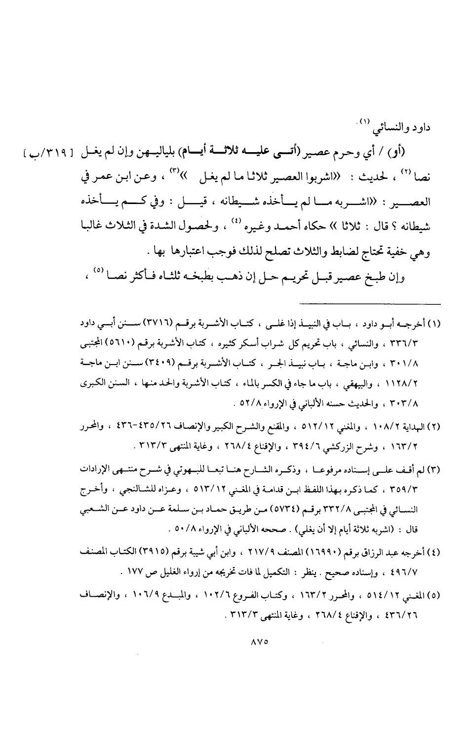 (¬3) لم أقف على إسناده مرفوعا، وذكره الشارح هنا تبعا للبهوتي في شرح منتهى الإرادات 3/ 359، كما ذكره بهذا اللفظ ابن قدامة في المغني 12/ 513، وعزاه للشالنجي، وأخرج النسائي في المجتبى 8/ 332 برقم (5734) من طريق حماد بن سلمة عن داود عن الشعبي قال: (اشربه ثلاثة أيام إلا أن يغلي). صححه الألباني في الإرواء 8/ 50.